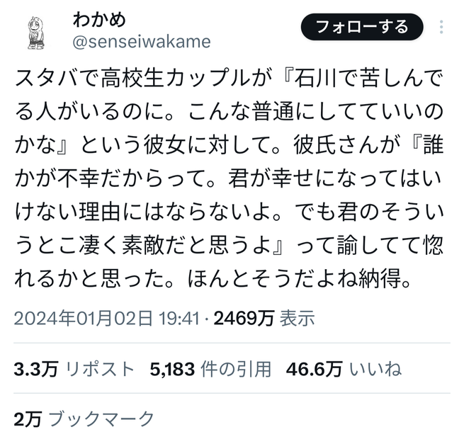 スタバのJK「震災で苦しんでる人がいるのに、普通にしてていいのかな」彼氏「いいんだよ」←46万いいね Twitter Facebook はてブ LINE コピー 2024.01.05 スポンサーリンク 1: それでも動く名無し 2024/01/04(木) 20:47:35.36 ID:XtAZMX/K0 イイハナシダナー https://twitter.com/senseiwakame/status/1742134000888807854 6: それでも動く名無し 2024/01/04(木) 20:48:17.69 ID:hDnVgbEE0 嘘松 8: それでも動く名無し 2024/01/04(木) 20:48:26.31 ID:5syfKaUg0 なんでいらん事言わなきゃ気がすまないんや 続きを読む