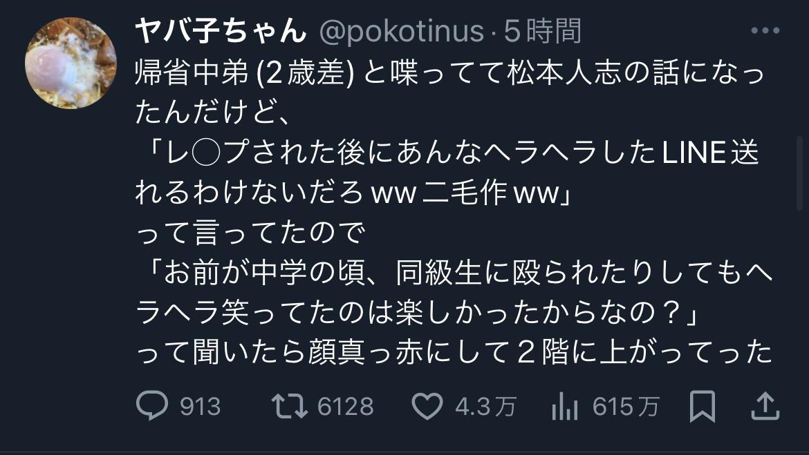 【画像】松本人志を擁護して被害者女を叩いてた弱男さん、完全論破されて顔真っ赤になってしまうwwwwwwwwww Twitter Facebook はてブ LINE コピー 2024.01.06 スポンサーリンク 1:それでも動く名無し:2024/01/06(土) 20:39:35.52 ID:oVTeRIvH0 2:それでも動く名無し:2024/01/06(土) 20:39:46.42 ID:oVTeRIvH0 言いすぎやろ… 3:それでも動く名無し:2024/01/06(土) 20:39:59.64 ID:Z74w+ubor これは魂の殺人 続きを読む