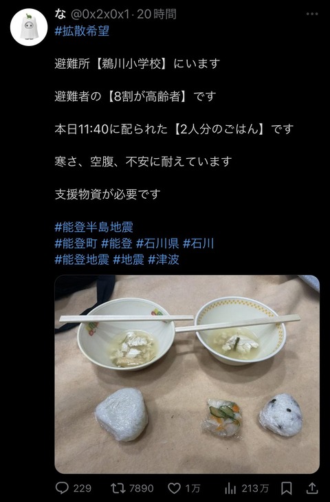 【画像】石川の避難所で提供された食事がこちら・・・・・・ Twitter Facebook はてブ LINE コピー 2024.01.06 スポンサーリンク 1:以下、?ちゃんねるからVIPがお送りします:2024/01/04(木) 09:18:12.304 ID:lYEN9ZQ20.net ※2人分 4:以下、?ちゃんねるからVIPがお送りします:2024/01/04(木) 09:19:01.505 ID:bXWXrlnO0.net あるだけマシだろ 7:以下、?ちゃんねるからVIPがお送りします:2024/01/04(木) 09:19:28.906 ID:j4in2Llbr.net 十分でワロタ 9:以下、?ちゃんねるからVIPがお送りします:2024/01/04(木) 09:19:50.619 ID:9SfSwxtW0.net 文句は言ってなくないか? 続きを読む