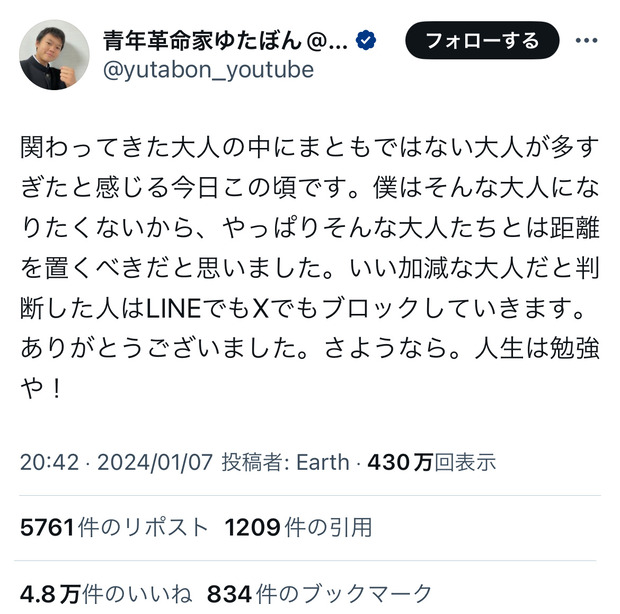 — 青年革命家ゆたぼん@登校中 (@yutabon_youtube) January 7, 2024