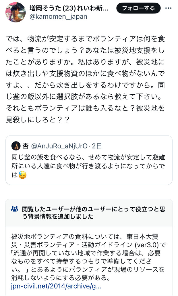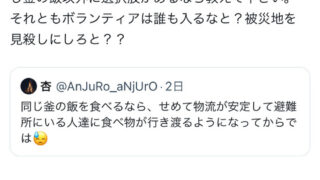 ボランティアたち「?君が『じゃあ物資がない時ボランティアは何食べればいいんですか』って言ったんじゃん。自分で持って行ってるならそれ食べれなよ」