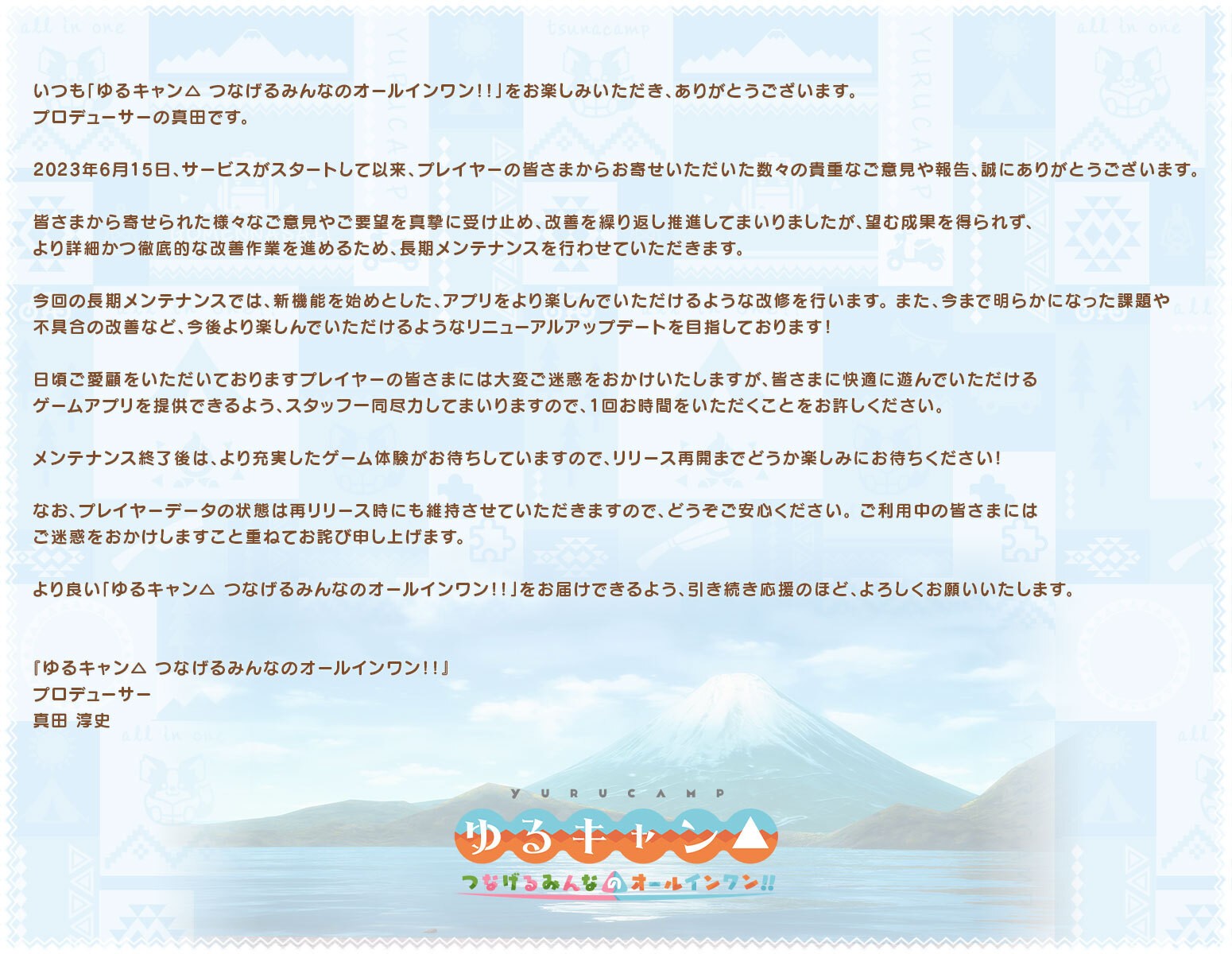 「つなキャン△」の長期メンテナンスについて、プロデューサーからお知らせが届いています。