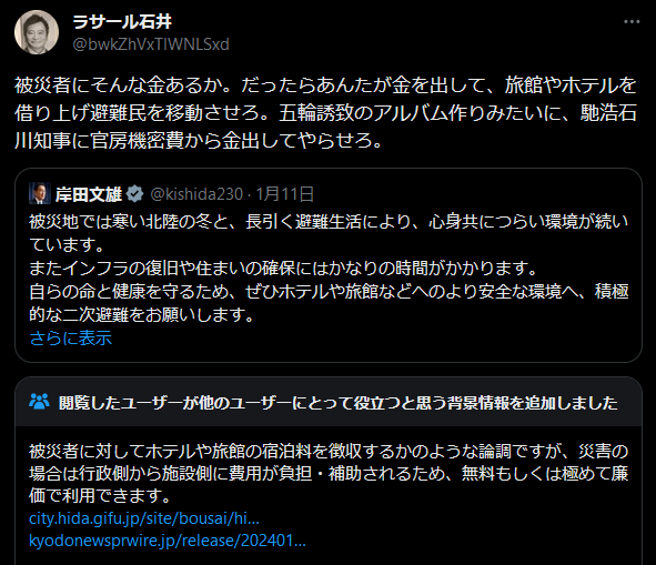 岸田首相は「二次避難について誤解を招きかねない、事実に基づかない投稿が散見されています」と指摘するのは、タレント・ラサール石井の投稿を意識したと思われる。