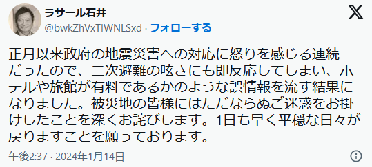 14日の投稿では「正月以来政府の地震災害への対応に怒りを感じる連続だったので、二次避難の呟きにも即反応してしまい、ホテルや旅館が有料であるかのような誤情報を流す結果になりました。被災地の皆様にはただならぬご迷惑をお掛けしたことを深くお詫びします。1日も早く平穏な日々が戻りますことを願っております。」とコメントした。「誤情報」をどのような形で入手したのといった経緯などは明かしていない。また、岸田首相、馳浩石川県知事についても言及していない。