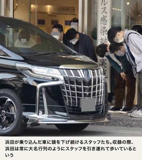 浜田が送迎車のアルファードに乗り込むと、彼らは一斉に頭を下げる。
