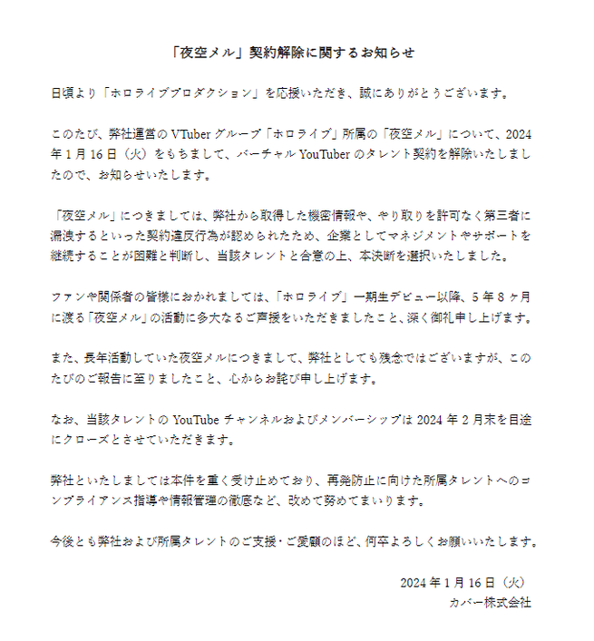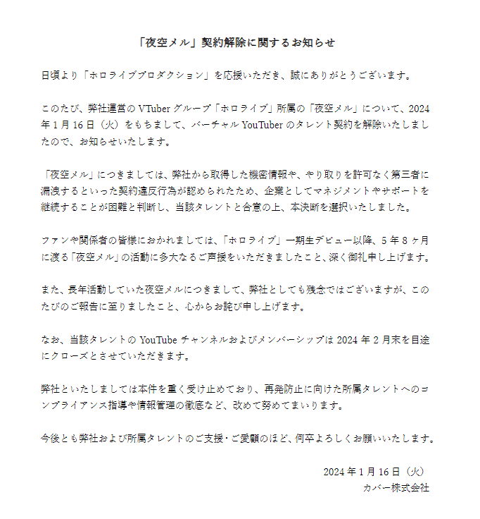 夜空メルさんについて、残念ながら弊社として契約解除という決断をするに至りました。