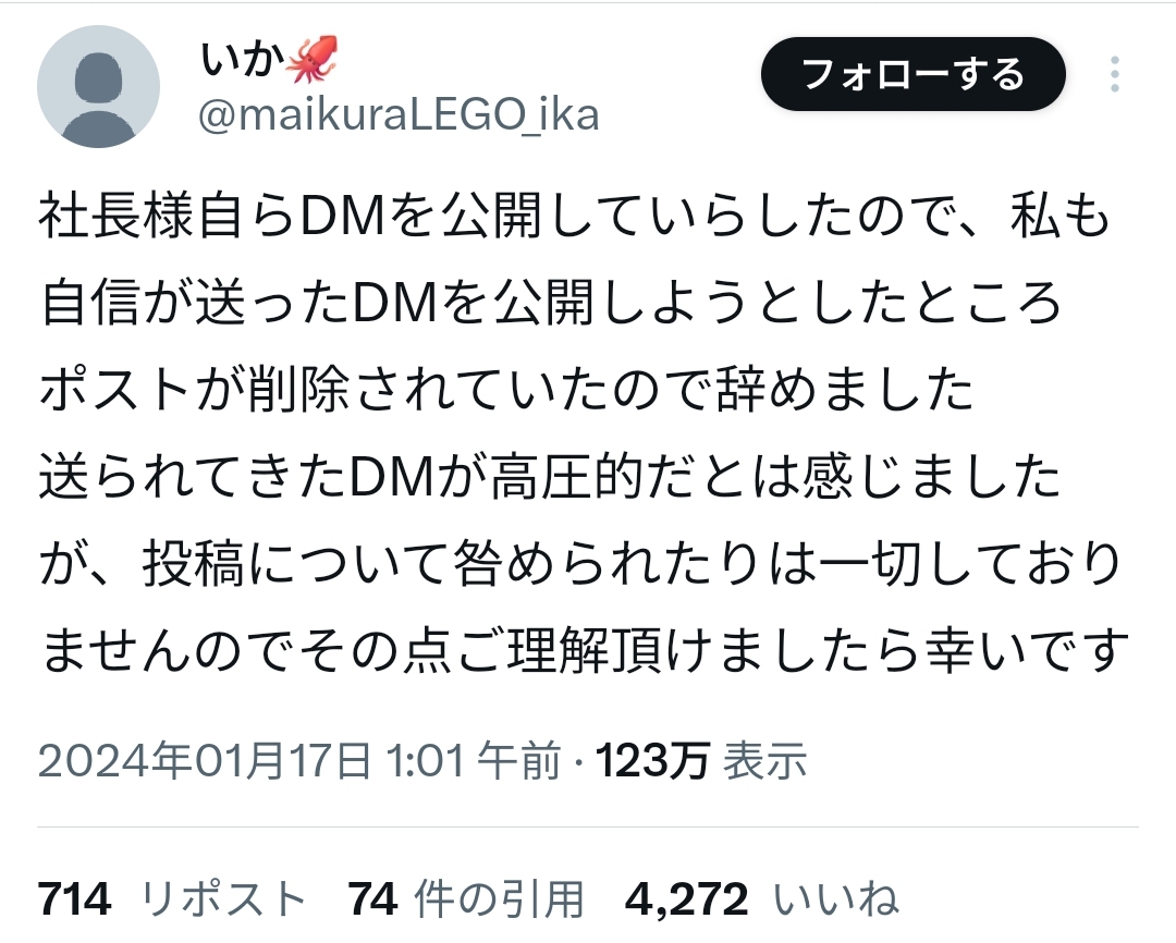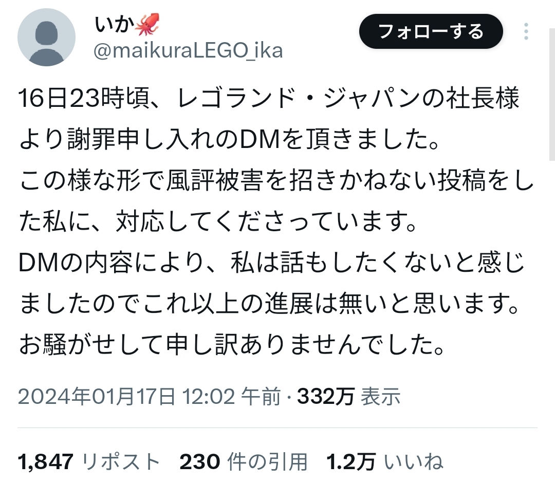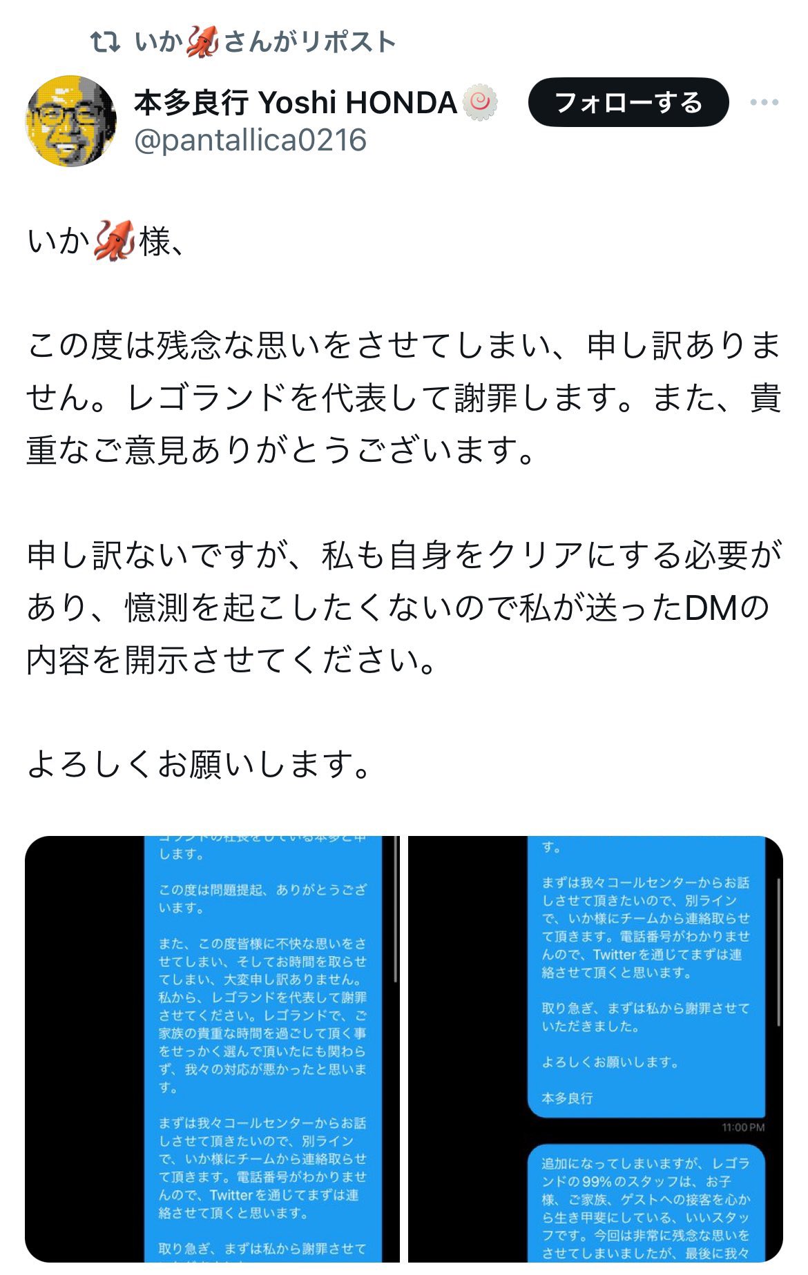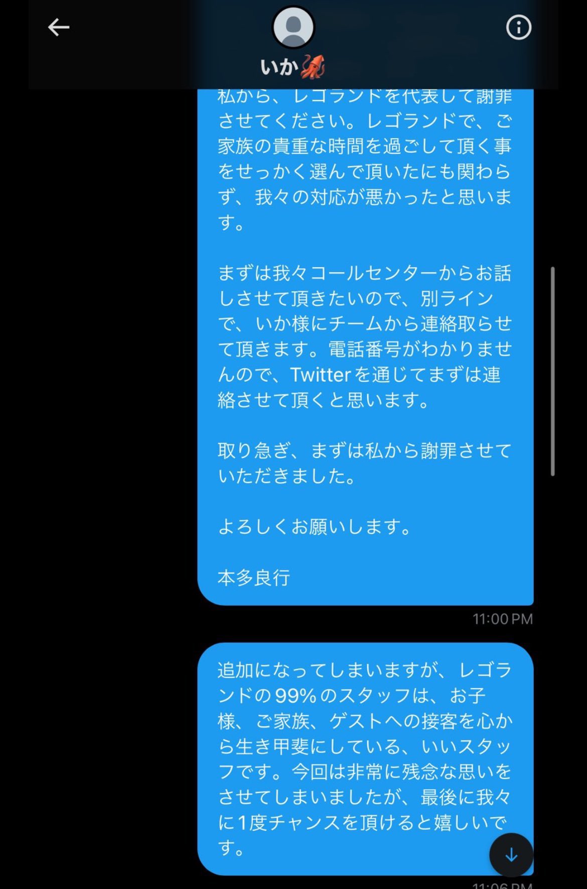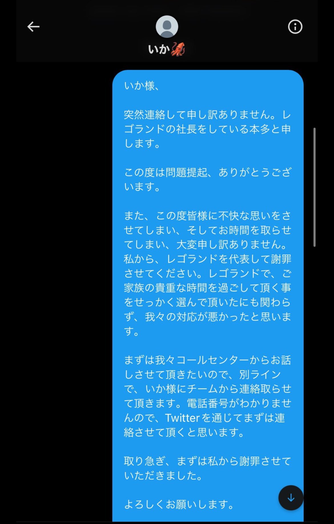 レゴランドの社長さん謝罪するはずが『自身をクリアにする必要があり』って言ってて自分の保身ですよね。そーいうところじゃないのかな。相手の了承なくDMのせてツイ消しするし。あと番号聞いてカスタマーセンターから電話するって社長自ら電話する訳じゃないんだ😫結局他人任せかって思っちゃうよ? pic.twitter.com/m4v3u8UhpV