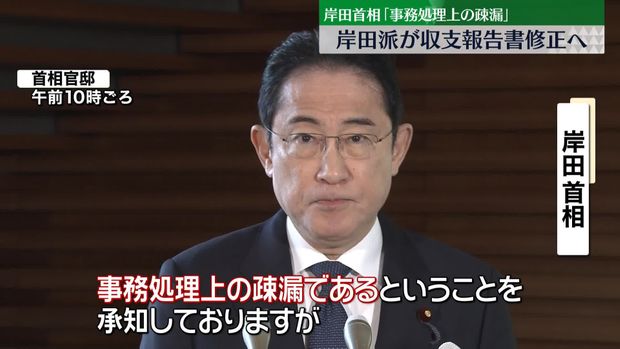 岸田首相「本日、宏池会(岸田派)において、収支報告の記載漏れ等について総務省に対して修正の申し入れを行うということ、私自身、報告を受けております。事務処理上の疎漏であるということを承知しておりますが、私自身(岸田派会長)在任中から今日までそれ以上のことは承知をしておりません」