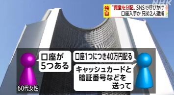 「病気で余命を宣告されたので資産を分配する」とSNSで呼びかけ、応募してきた人にキャッシュカードなどを送らせたとして、20代の兄弟2人が犯罪収益移転防止法違反の疑いで大阪府警に逮捕されたことが捜査関係者への取材で分かりました。
