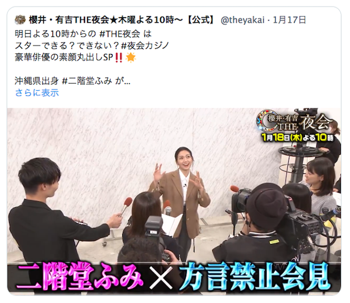 番組は、沖縄県出身の二階堂さんが沖縄弁の質問につられることなく、方言を話さずに「標準語」で返答できるか