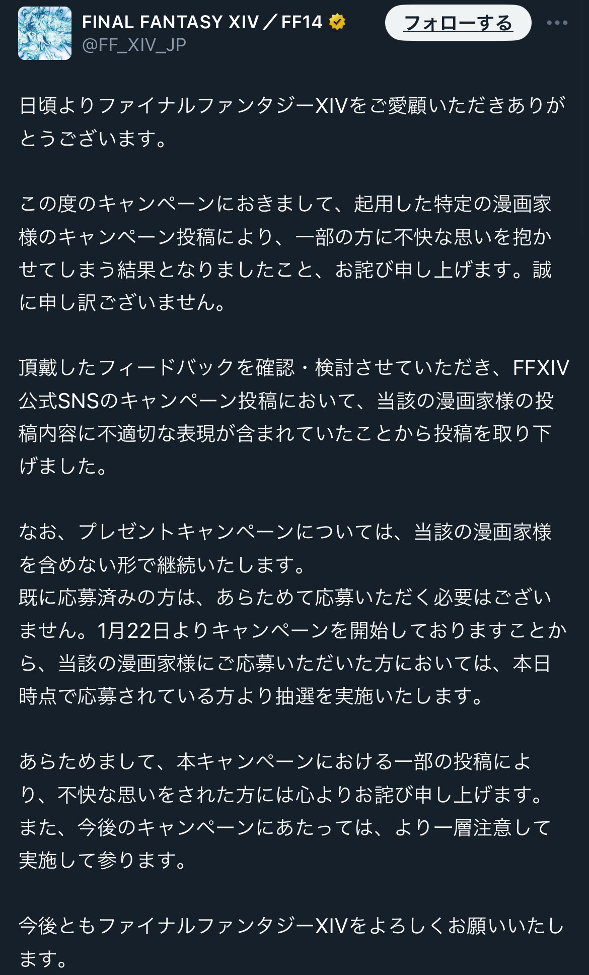 この度のキャンペーンにおきまして、起用した特定の漫画家様のキャンペーン投稿により、一部の方に不快な思いを抱かせてしまう結果となりましたこと、お詫び申し上げます。誠に申し訳ございません。…