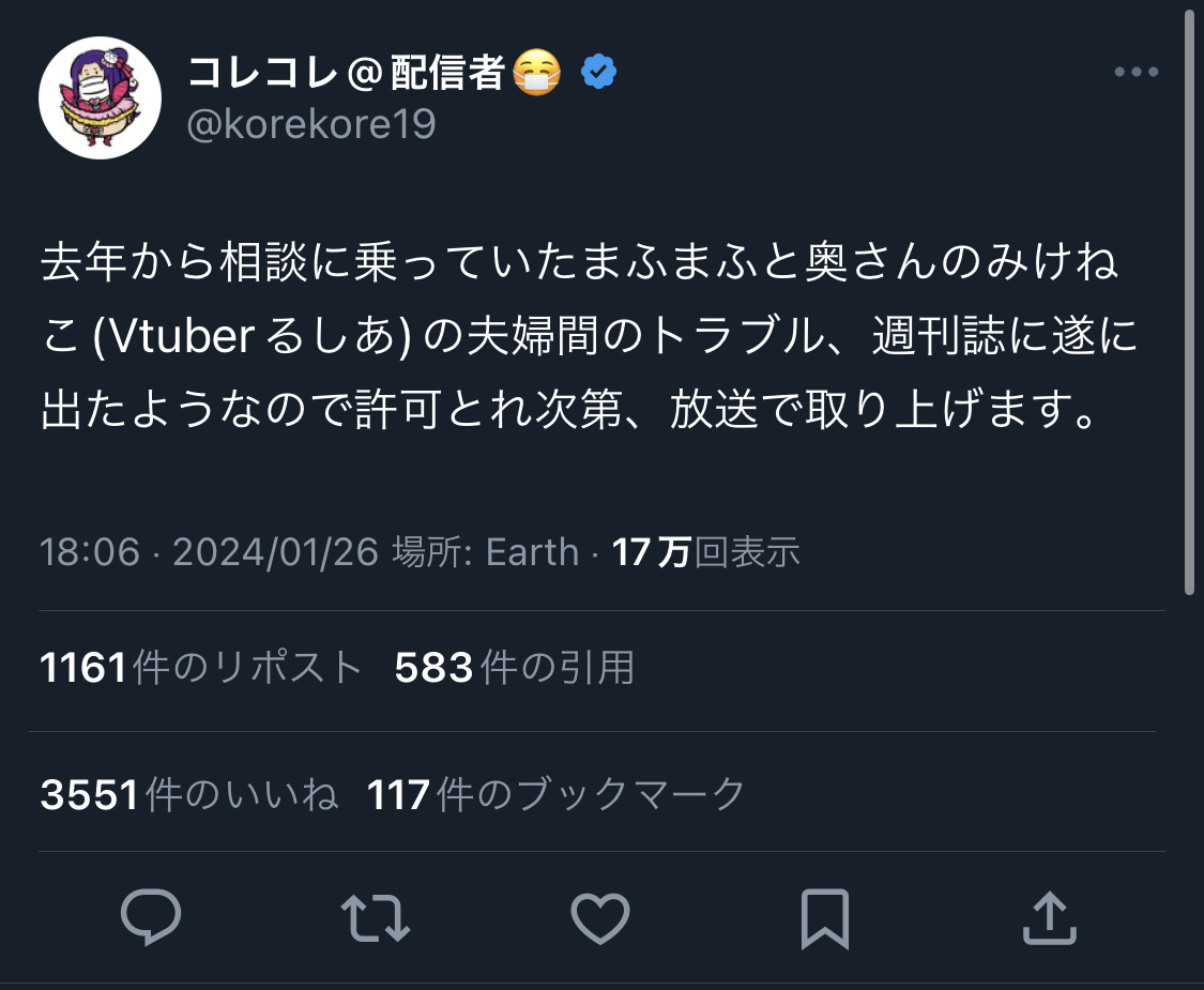 まふまふさん、みけねこ(VTuberるしあ)と結婚してた Twitter Facebook はてブ LINE コピー 2024.01.26 スポンサーリンク 1: それでも動く名無し 2024/01/26(金) 18:28:08.21 ID:YrgVpuzS0 !? 2: それでも動く名無し 2024/01/26(金) 18:28:14.58 ID:YrgVpuzS0 マジか? 4: それでも動く名無し 2024/01/26(金) 18:28:34.43 ID:1MOg/ogR0 奥さんだった…? 続きを読む