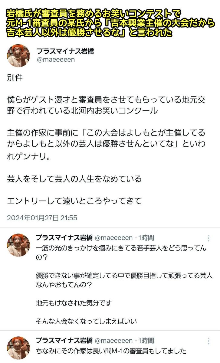 プラスマイナス岩橋さん、TV制作会社社長のパワハラ暴行を告発!お笑いコンクールが出来レースだったことも暴露