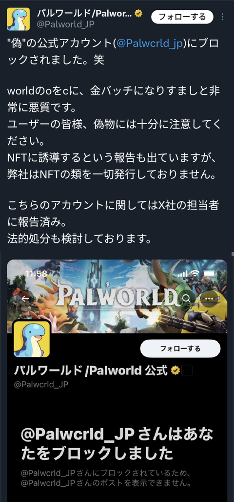 【画像】パルワールド運営、逆に法的措置wwwwwwwwww Twitter Facebook はてブ LINE コピー 2024.01.29 スポンサーリンク 1:以下、?ちゃんねるからVIPがお送りします:2024/01/28(日) 22:48:32.781 ID:Q5TipLdd0 2:以下、?ちゃんねるからVIPがお送りします:2024/01/28(日) 22:49:49.066 ID:QN/j0Ven0 ワロタwww 3:以下、?ちゃんねるからVIPがお送りします:2024/01/28(日) 22:49:54.585 ID:+Bq2TGel0 ブロックされてて草 続きを読む