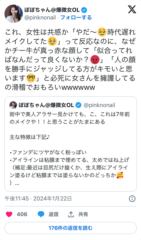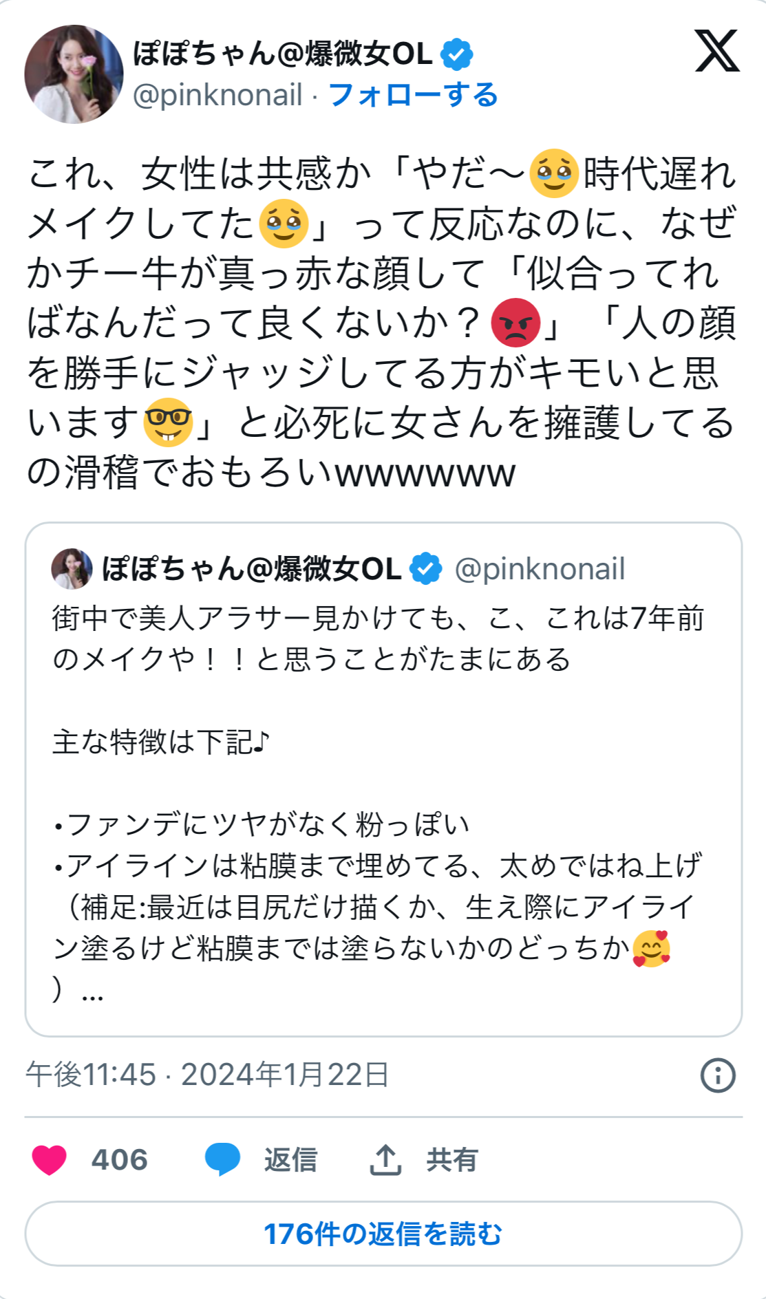 整形弱女「時代遅れメイクの女ww」普通の男女「似合ってれば良くね?」整形弱女「チギュアア!!」 Twitter Facebook はてブ LINE コピー 2024.01.30 スポンサーリンク 1:それでも動く名無し:2024/01/29(月) 22:25:24.43 ID:LNDnow+c0NIKU 2:それでも動く名無し:2024/01/29(月) 22:25:46.13 ID:vpwo0ZLU0NIKU めっちゃ効いてるやん 3:それでも動く名無し:2024/01/29(月) 22:26:01.09 ID:kzzci4pH0NIKU 詳細な説明は効きすぎてる証拠 続きを読む