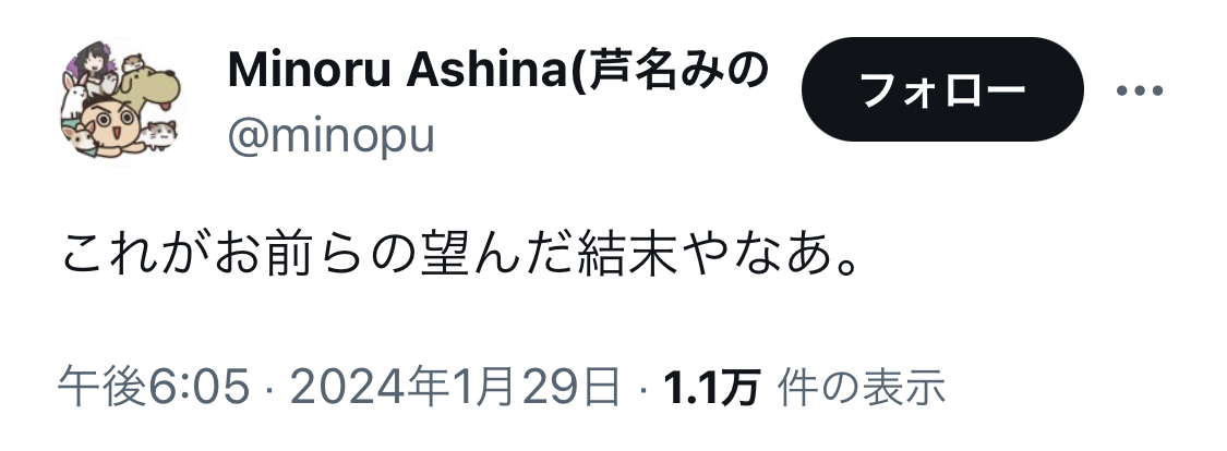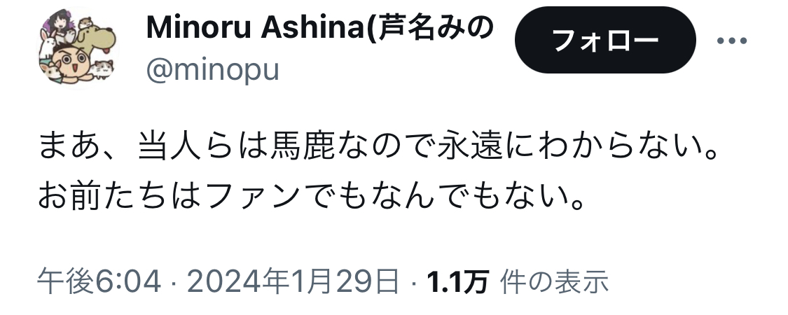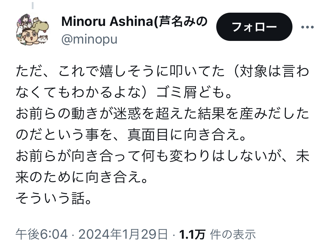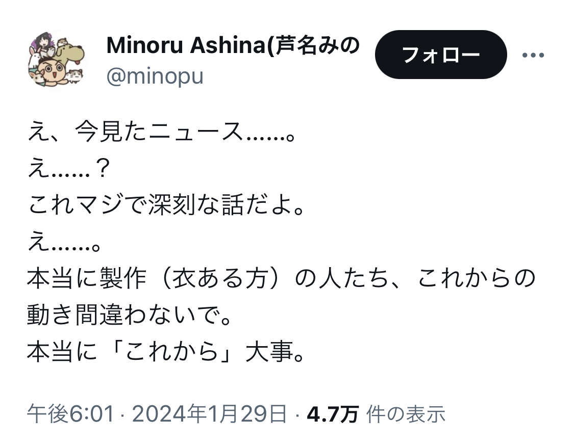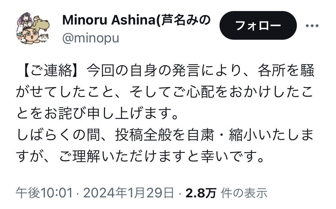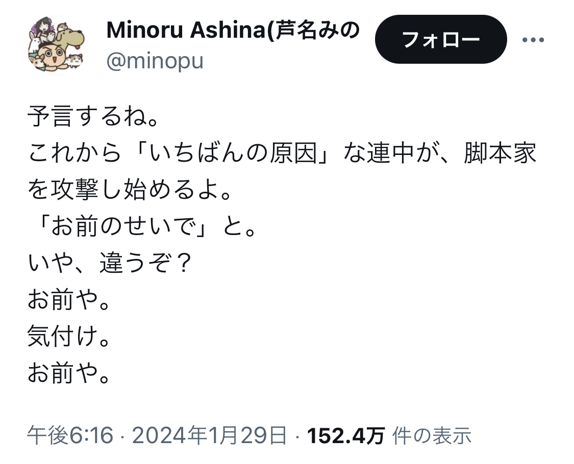 アニメ「スナックバス江」監督の芦名みのる氏、セクシー田中さん作者死去めぐる一連のポストを謝罪 Twitter Facebook はてブ LINE コピー 2024.01.30 スポンサーリンク 1: それでも動く名無し 2024/01/30(火) 00:00:38.73 ID:DuorKAx/0 ↓ 2: それでも動く名無し 2024/01/30(火) 00:01:25.34 ID:qLjbohF00 「いちばんの原因」とかなんで断定してるの? あんた本人なの? 3: それでも動く名無し 2024/01/30(火) 00:02:04.31 ID:Bvi0AwmGH 煽ったゴミクズ共に謝罪に追い込まれてて草 続きを読む