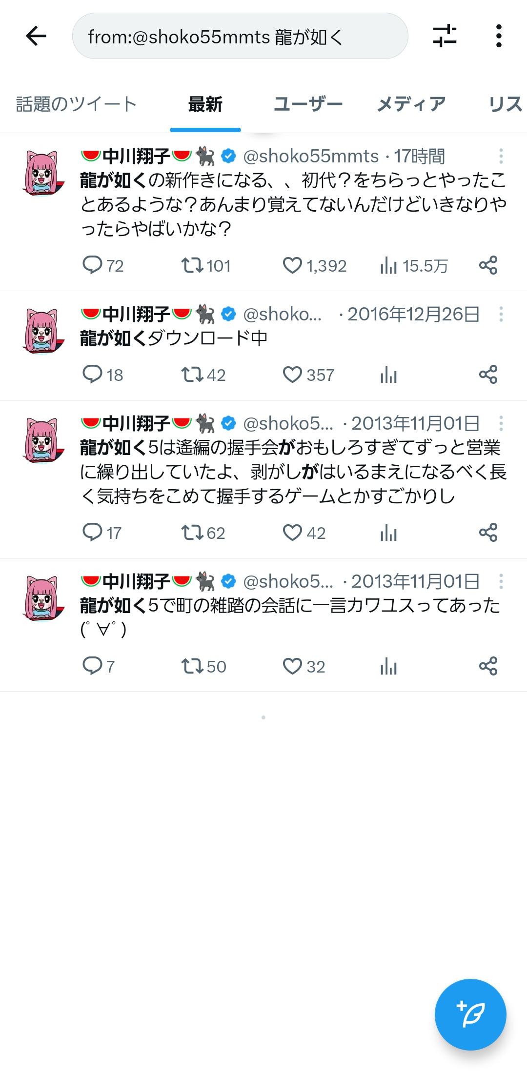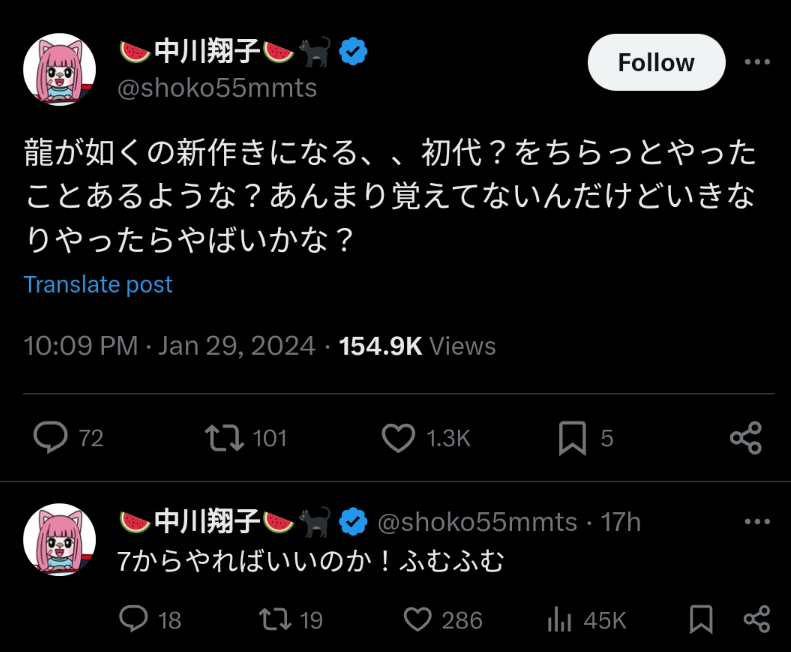中川翔子さん「龍が如くの新作気になる!初代ちょっとやっただけだけど大丈夫かな?」 Twitter Facebook はてブ LINE コピー 2024.01.30 スポンサーリンク 1: それでも動く名無し 2024/01/30(火) 16:45:11.34 ID:KZSYDvE50 https://twitter.com/shoko55mmts/status/1751955619492544512 2: それでも動く名無し 2024/01/30(火) 16:45:38.30 ID:KZSYDvE50 3: それでも動く名無し 2024/01/30(火) 16:46:25.64 ID:KZSYDvE50 5: それでも動く名無し 2024/01/30(火) 16:47:27.48 ID:uJk3Zd8n0 三段落ちやめーや 続きを読む