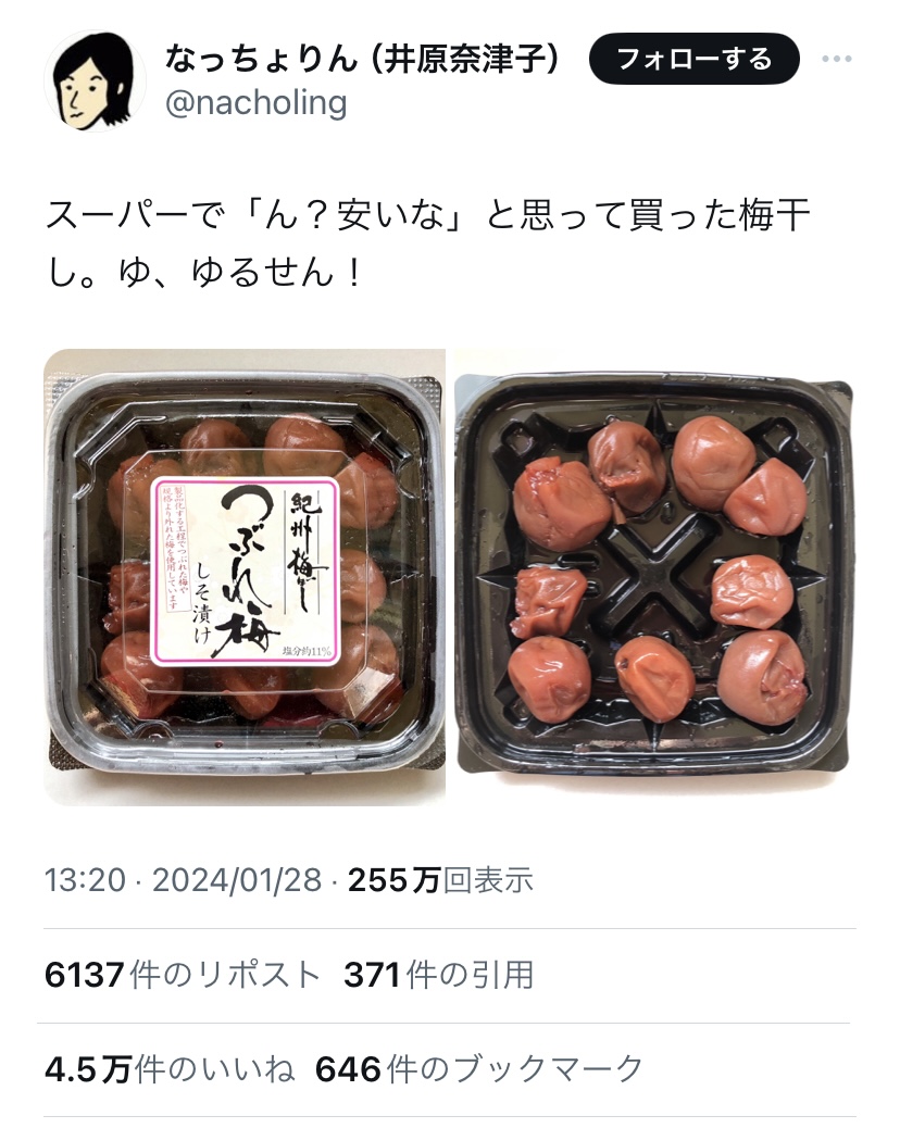 【画像】セブンイレブンみたいな梅干し ついに見つかるwowowowowowow Twitter Facebook はてブ LINE コピー 2024.01.31 スポンサーリンク 1:それでも動く名無し:2024/01/29(月) 03:09:20.09 ID:dVRxA72x0.net 3:それでも動く名無し:2024/01/29(月) 03:11:08.21 ID:dmyo8G9j0.net 一時期内容量詐欺で中国とか韓国バカにしてた時期あったけど まさか日本がこうなるとは思わんかったわ 続きを読む
