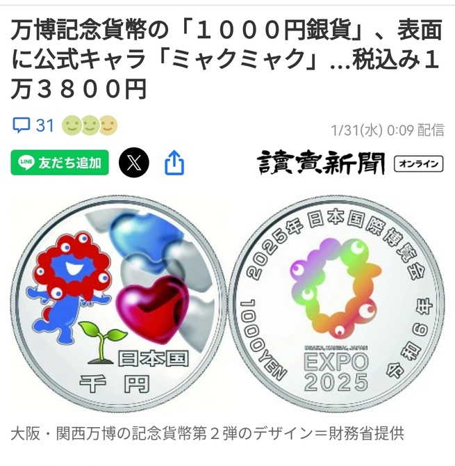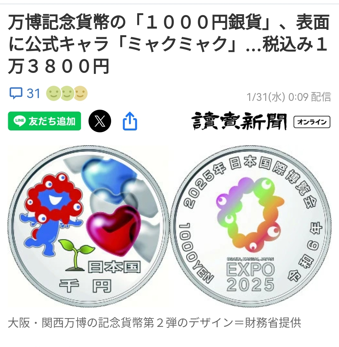 万博記念貨幣の「1000円銀貨」、表面に公式キャラ「ミャクミャク」…税込み1万3800円 : 読売新聞オンライン https://t.co/TgE5YipnoT #大阪・関西万博 #記念貨幣 #1000円銀貨 #ミャクミャク