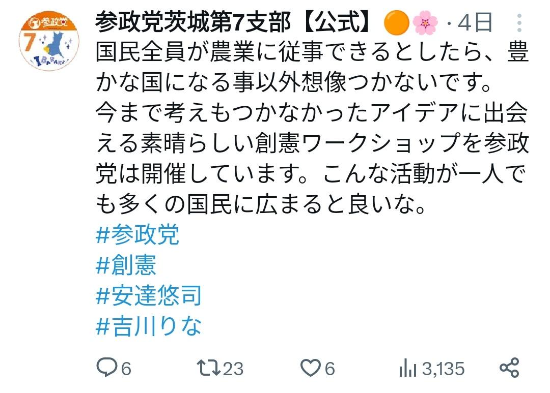 【朗報】参政党「国民全員が農民になれば世界取れる!!!!!!」 Twitter Facebook はてブ LINE コピー 2024.02.03 スポンサーリンク 1:2024/02/03(土) 09:02:25.694 ID:jaB9sFPId.net国民全員が農業に従事できるとしたら、豊かな国になる事以外想像つかないです。今まで考えもつかなかったアイデアに出会える素晴らしい創憲ワークショップを参政党は開催しています。こんな活動が一人でも多くの国民に広まると良いな。#参政党#創憲#安達悠司#吉川りな— 参政党茨城第7支部【公式】🟠🌸 (@sanseitoibrk7_1) January 28, 2024たしかに転載元スレッド:https://viper.2ch.sc/test/read.cgi/news4vip/1706918545/ 続きを読む