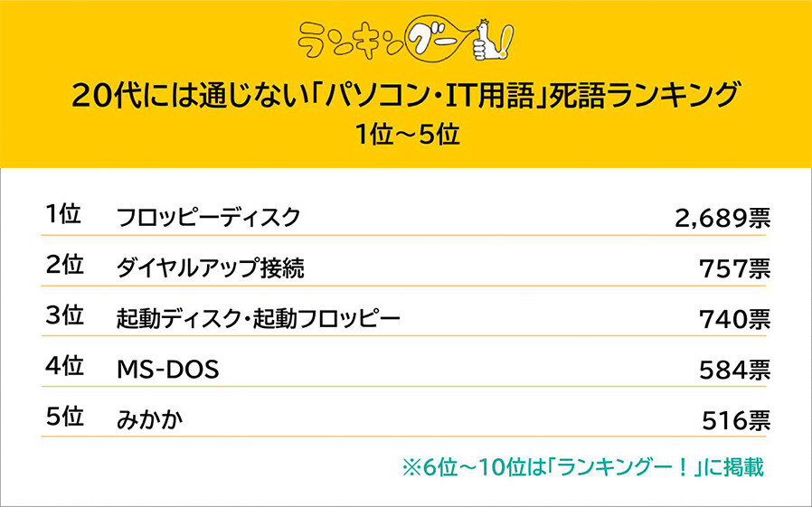メディア事業を運営するCMサイトは、30代以上の男女9944人を対象に、今の20代には通じないと思われるIT用語を募集した。