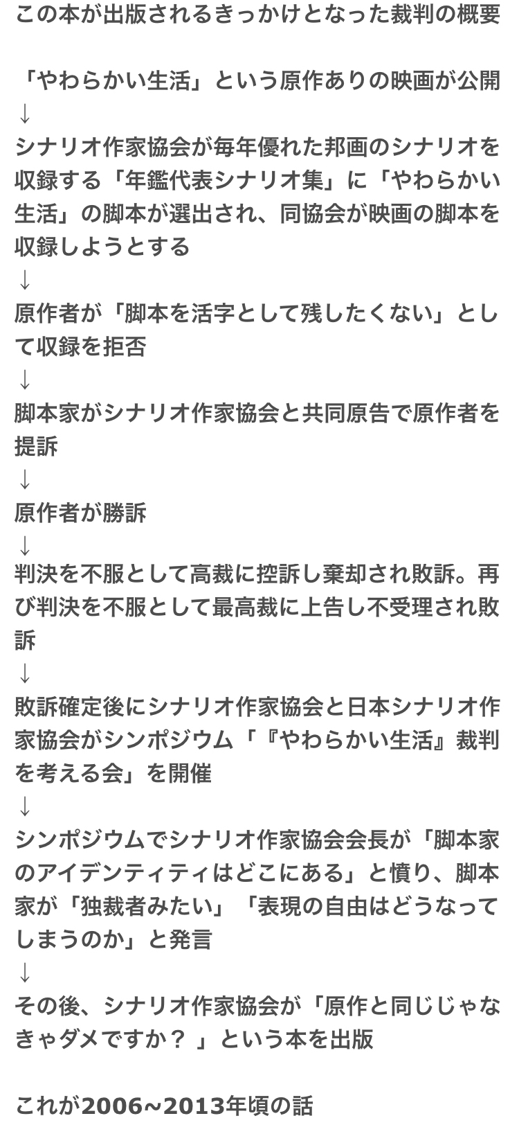 この本は「やわらかい生活」という映画の脚本家が原作者を訴えて敗訴した裁判について脚本家の視点で意見が書かれているようだ。