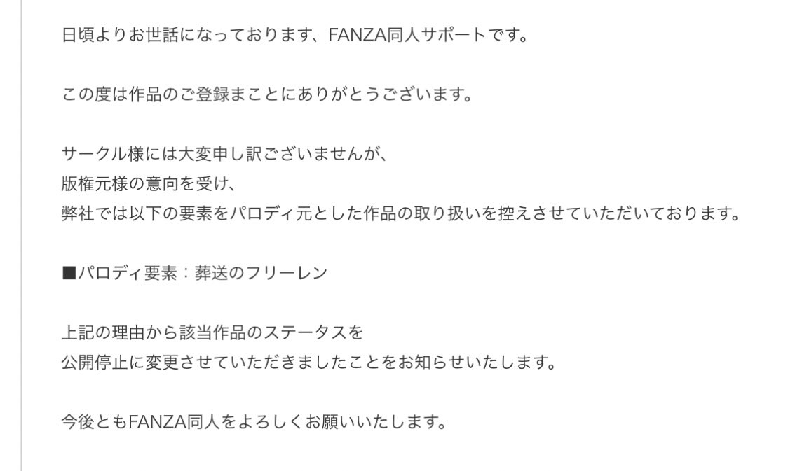 FANZA、「葬送のフリーレン」の同人販売を禁止してしまう Twitter Facebook はてブ LINE コピー 2024.02.05 スポンサーリンク 1 : それでも動く名無し 2024/02/05(月) 15:15:07.69 ID:86V75Be40 こんなん許されるんか… https://twitter.com/wwood126/status/1754338374348128753 3 : それでも動く名無し 2024/02/05(月) 15:15:53.27 ID:BN/8Hh+q0 ガチで草 4 : それでも動く名無し 2024/02/05(月) 15:15:58.22 ID:CtHtjM6K0 今は原作者が強いからな 続きを読む