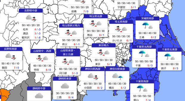 本州の南岸を通る低気圧の影響で5日、関東甲信を中心に広い範囲で湿った雪が降った。降雪のピークは5日夜遅くにかけてとみられ、気象庁は早めの帰宅を呼びかけた。