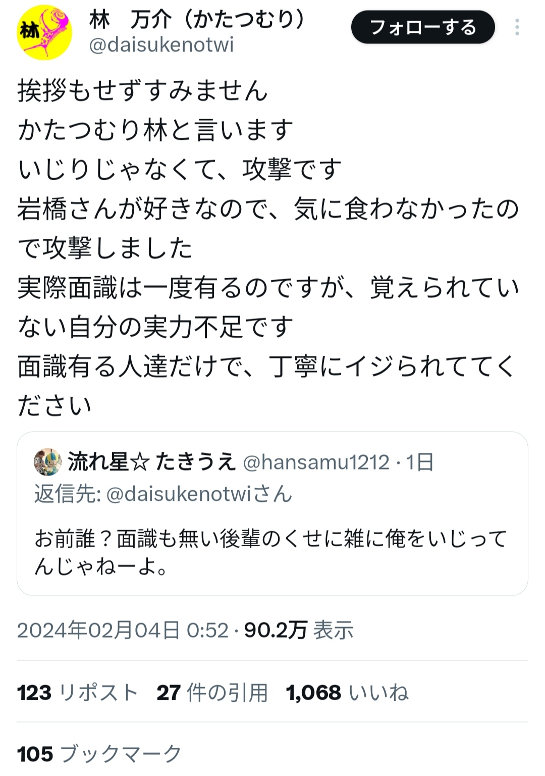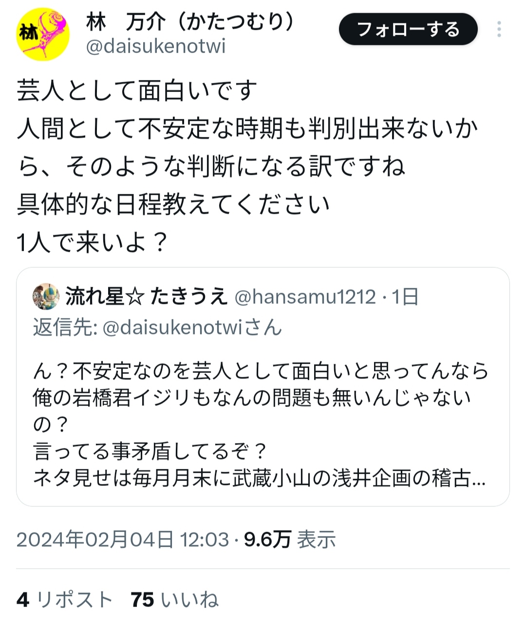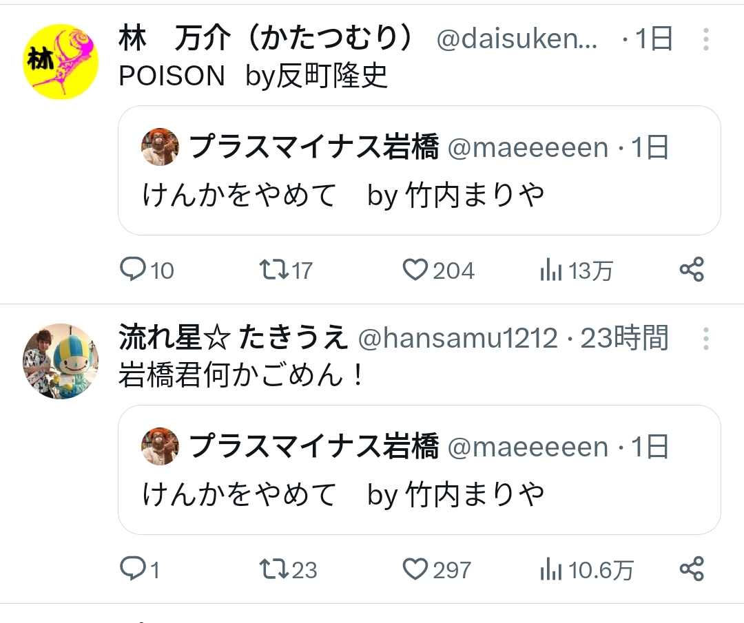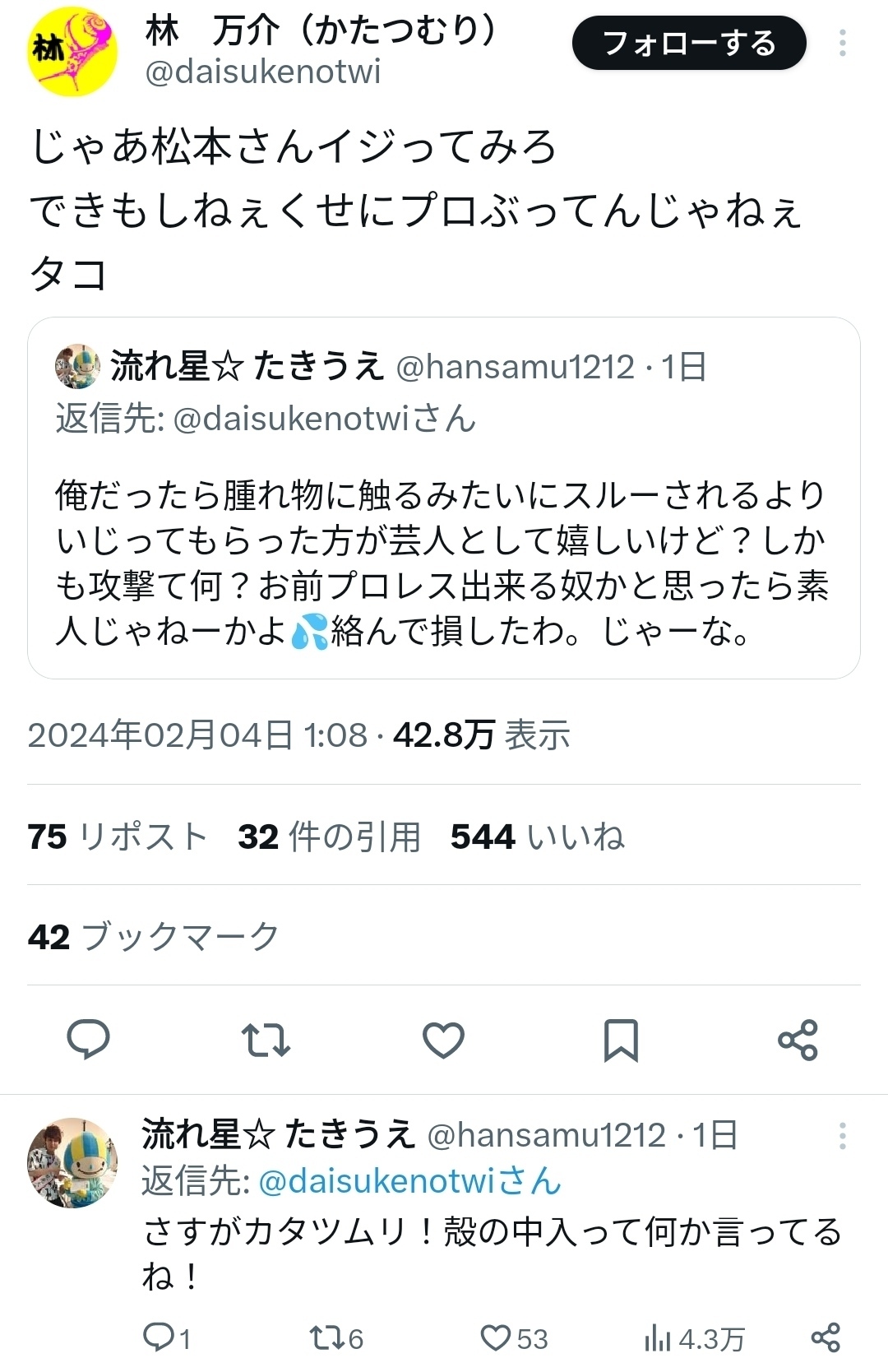 プラマイ岩橋の後輩芸人、岩橋を雑にいじる芸人にキレる「ほな松本人志のこともいじってみろや」 Twitter Facebook はてブ LINE コピー 2024.02.06 スポンサーリンク 1 : それでも動く名無し 2024/02/05(月) 22:40:16.54 ID:1zU1LwRb0 2 : それでも動く名無し 2024/02/05(月) 22:40:30.68 ID:1zU1LwRb0 これレスバこいつの勝ちやろ 3 : それでも動く名無し 2024/02/05(月) 22:40:41.19 ID:YFz9Y/Ts0 熱くて草 続きを読む