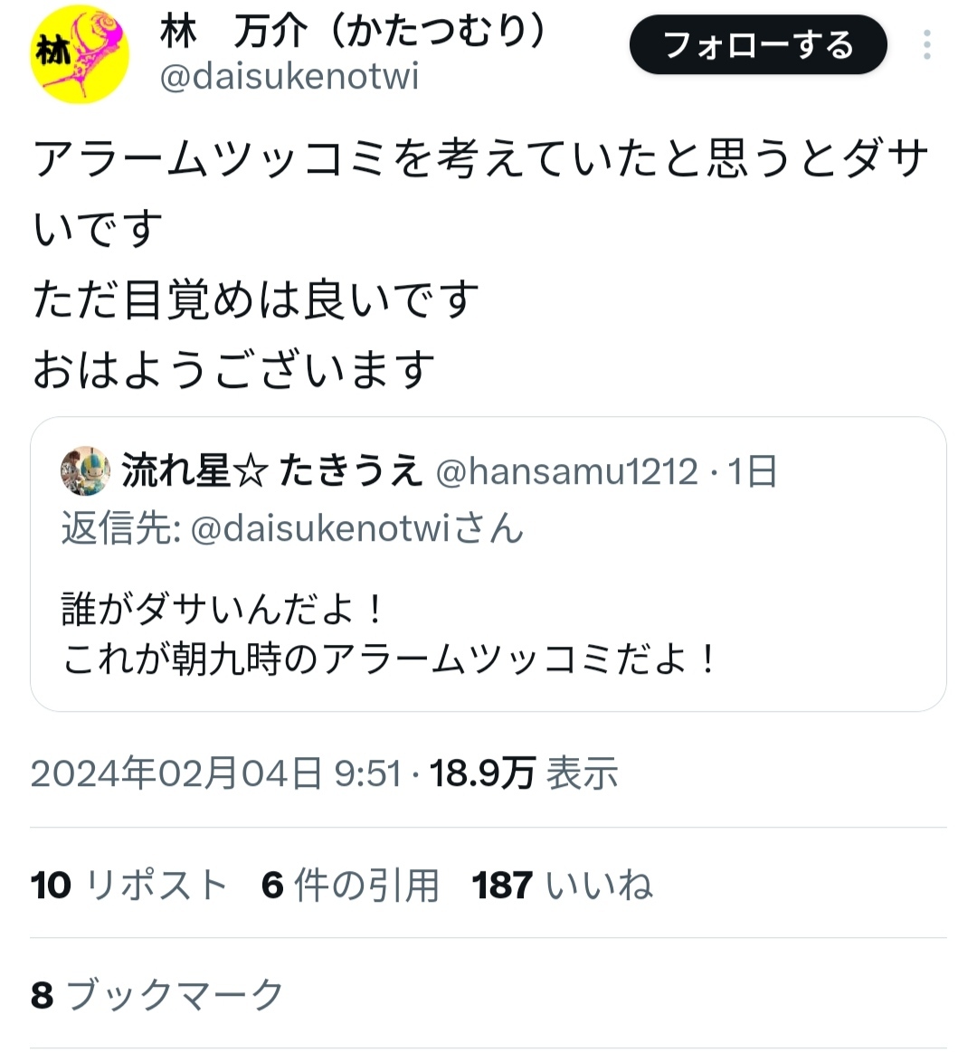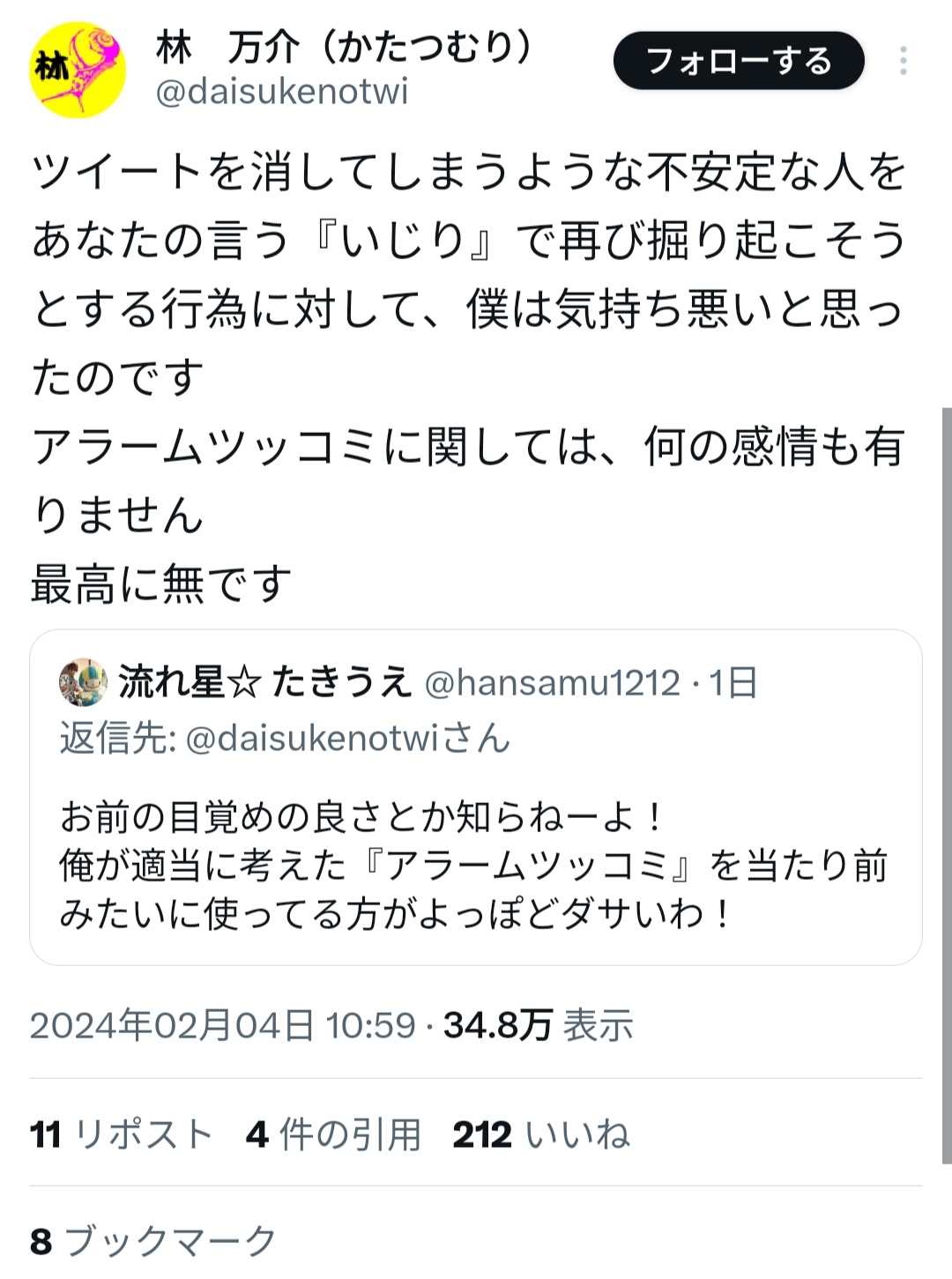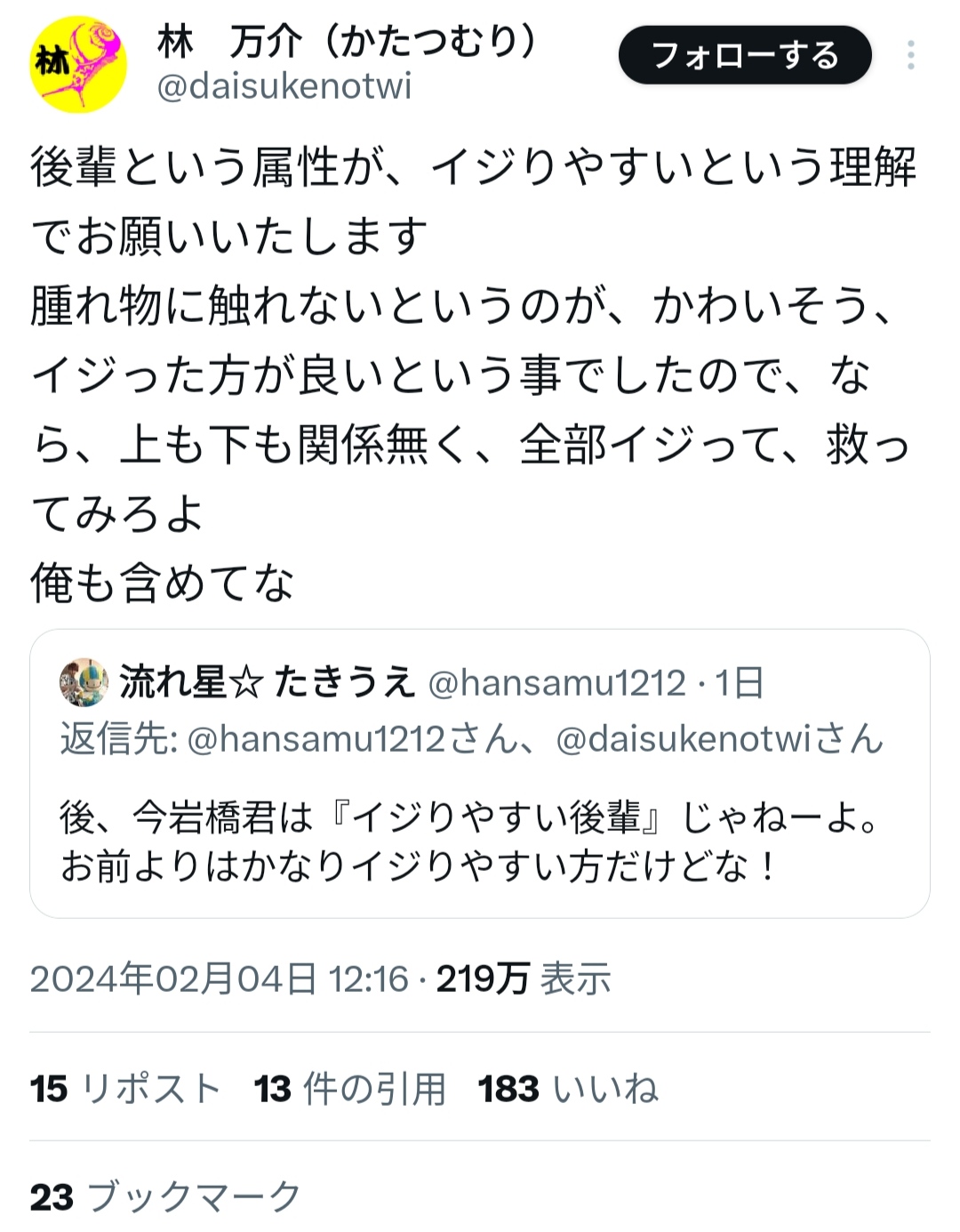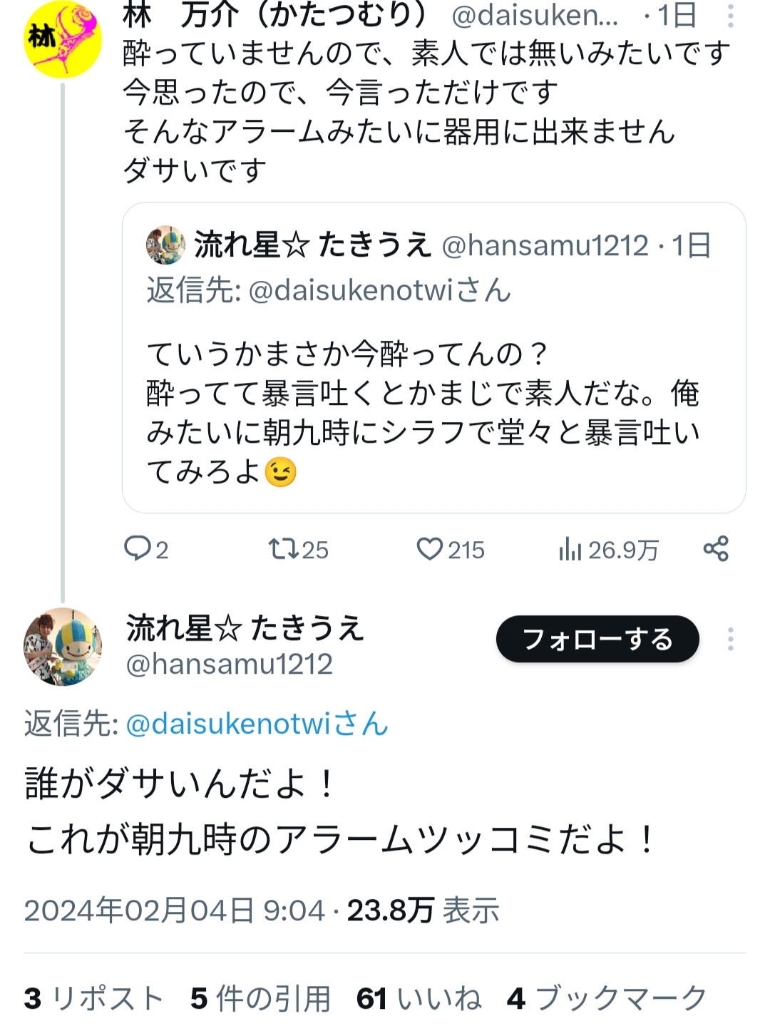 プラマイ岩橋の後輩芸人、岩橋を雑にいじる芸人にキレる「ほな松本人志のこともいじってみろや」 Twitter Facebook はてブ LINE コピー 2024.02.06 スポンサーリンク 1 : それでも動く名無し 2024/02/05(月) 22:40:16.54 ID:1zU1LwRb0 2 : それでも動く名無し 2024/02/05(月) 22:40:30.68 ID:1zU1LwRb0 これレスバこいつの勝ちやろ 3 : それでも動く名無し 2024/02/05(月) 22:40:41.19 ID:YFz9Y/Ts0 熱くて草 続きを読む