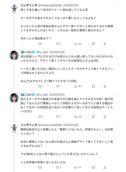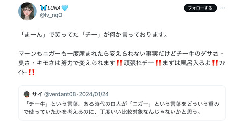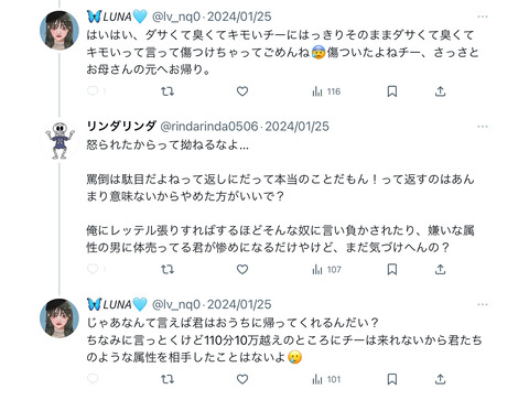 【大悲報】チー牛、風俗嬢に論破され涙目逃走wxxwxxwxxwxx Twitter Facebook はてブ LINE コピー 2024.02.06 スポンサーリンク 1:それでも動く名無し:2024/02/05(月) 21:50:57.37 ID:UHKBs0EE0 2:それでも動く名無し:2024/02/05(月) 21:51:21.41 ID:UHKBs0EE0 その後、返信はなし 5:それでも動く名無し:2024/02/05(月) 21:56:50.47 ID:WI6yQg9G0 不毛な争い 続きを読む