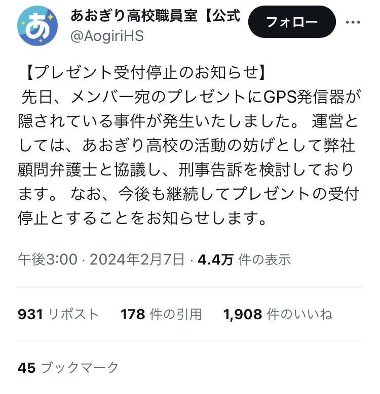 【悲報】Vtuber事務所「プレゼントにGPS発信機が仕込まれてた。刑事告訴します」 Twitter Facebook はてブ LINE コピー 2024.02.07 スポンサーリンク ◇ 1: 名無しさん 2024/02/07(水) 15:16:57.33 ID:a5RhhAKYd https://twitter.com/AogiriHS/status/1755109132451881245 ◇ 2: 名無しさん 2024/02/07(水) 15:17:25.62 ID:a5RhhAKYd ヤバすぎでしょ…… ◇ 4: 名無しさん 2024/02/07(水) 15:17:45.77 ID:a5RhhAKYd ストーカーやん 続きを読む