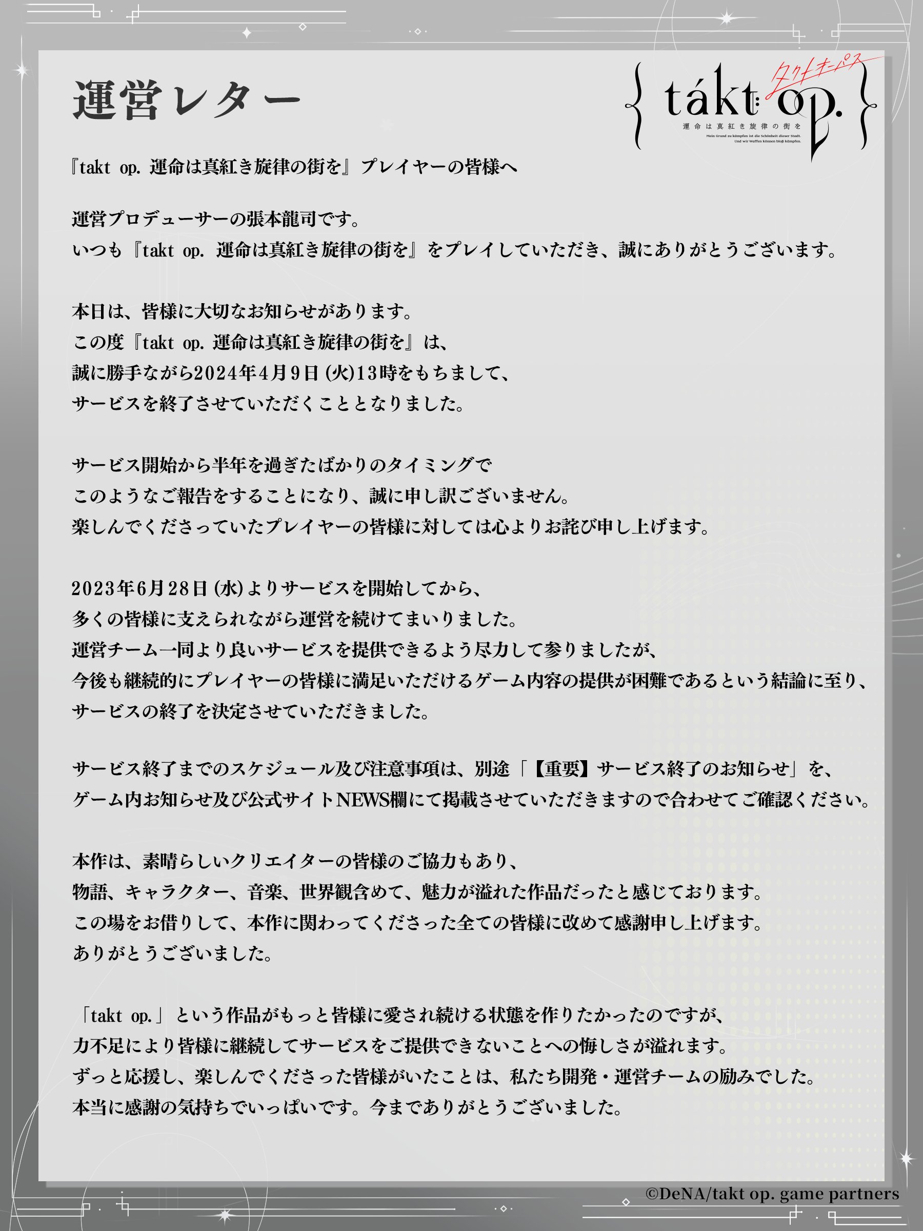 『takt op. 運命は真紅き旋律の街を』は2024年4月9日(火)13:00をもちまして、サービスを終了させていただくこととなりました。