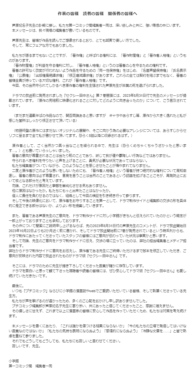 芦原妃名子さんの死去を受け、小学館の編集者一同が読者・作家・関係者へ声明を出す Twitter Facebook はてブ LINE コピー 2024.02.08 スポンサーリンク 作家の皆様 読者の皆様 関係者の皆様へhttps://t.co/f5lDTBF4yh小学館 第一コミック局編集者一同— プチコミック【公式】 (@petitcomic) 2024年2月8日 続きを読む