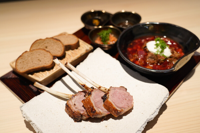 藤井王将 ラム肉の炭火焼き(甘辛酸の3種のソース)・ボルシチ・ライ麦パン・野菜のピクルス・和紅茶(冷)