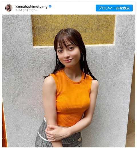 写真に写る橋本はオレンジのノースリーブニットを着用しており、服の上からでもわかる抜群スタイルを披露している。