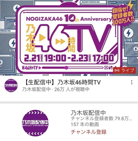 乃木坂46「登録者数75万人から100万人目指して2日間配信しまーす!」→残り1時間で現在79.8万人 Twitter Facebook はてブ LINE コピー 2022.02.23 スポンサーリンク 1:風吹けば名無し:2022/02/23(水) 16:06:35.62 ID:WY9fNNJA0.net どうするんだよこれ 2:ソガイレジェンド :2022/02/23(水) 16:06:53.55 ID:WY9fNNJA0.net 大人気アイドルなのに… 3:ソガイレジェンド :2022/02/23(水) 16:07:08.98 ID:WY9fNNJA0.net あと20万人… 続きを読む