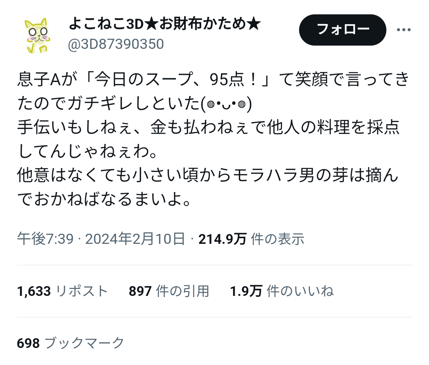 【悲報】息子さん「今日のスープ、95点!✨」母親さん「!!?」ギャオオオン Twitter Facebook はてブ LINE コピー 2024.02.12 スポンサーリンク ◇ 1: それでも動く名無し 2024/02/11(日) 22:19:54.68 ID:7o5LbBd/0 モラ夫の芽は摘まれた https://twitter.com/3D87390350/status/1756266568437448938 ◇ 2: それでも動く名無し 2024/02/11(日) 22:20:25.40 ID:jsIYNBtX0 ひえ ◇ 4: それでも動く名無し 2024/02/11(日) 22:20:42.99 ID:yVv5qHJL0 100点でもキレられたんやろな 続きを読む