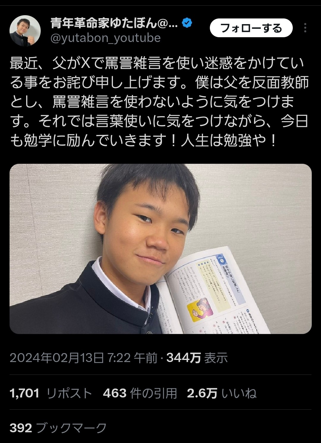 最近、父がXで罵詈雑言を使い迷惑をかけている事をお詫び申し上げます。僕は父を反面教師とし、罵詈雑言を使わないように気をつけます。それでは言葉使いに気をつけながら、今日も勉学に励んでいきます!人生は勉強や! pic.twitter.com/5UoiwigTpk