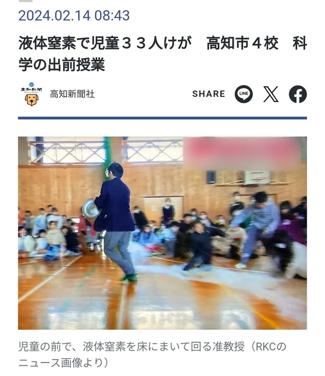 高知市は13日、市内の小学校4校で7、8日に開かれた科学の出前講座に参加した児童計33人が、実験で使った液体窒素で軽度の凍傷となったり、肌の痛みや赤みが生じたりしたと発表した。