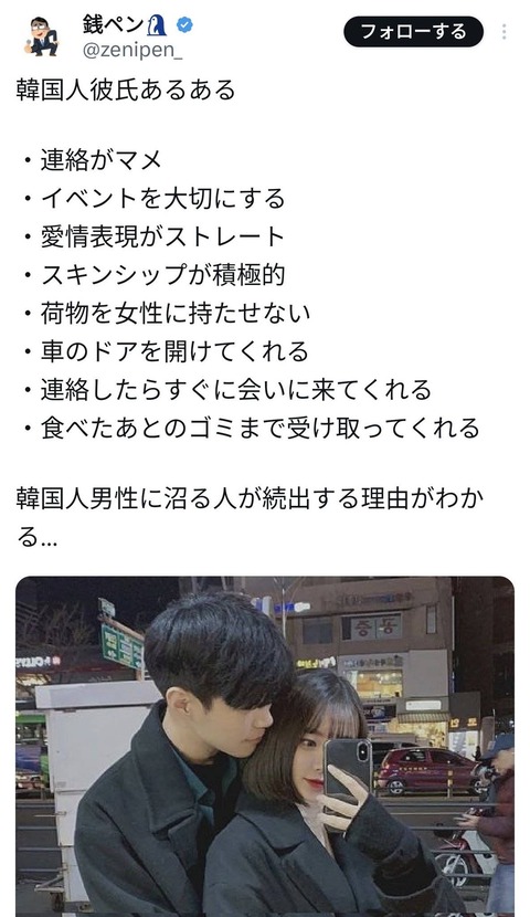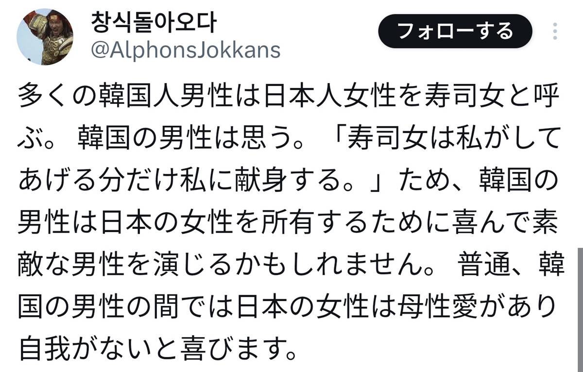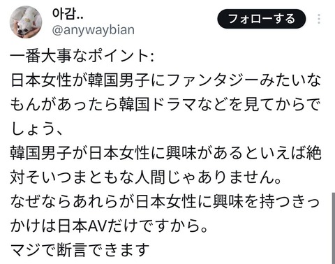 【炎上】 ツイ民 「韓国人の彼氏にハマる日本人女性が続出する原因がこれ」 → 韓国女「全部ウソ」 Twitter Facebook はてブ LINE コピー 2024.02.16 スポンサーリンク 2:d(東京都) [US]:2024/02/16(金) 13:35:30.43 ID:5u2IvE270 BE:593349633-PLT(15000) 27:名無しさん@涙目です。(庭) [US]:2024/02/16(金) 13:42:10.94 ID:bWPLp02Q0 >>2 最後のやつが辛辣で草 87:名無しさん@涙目です。(東京都) [US]:2024/02/16(金) 14:00:10.67 ID:vFsovdKM0 >>2 ワロタw 続きを読む