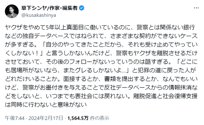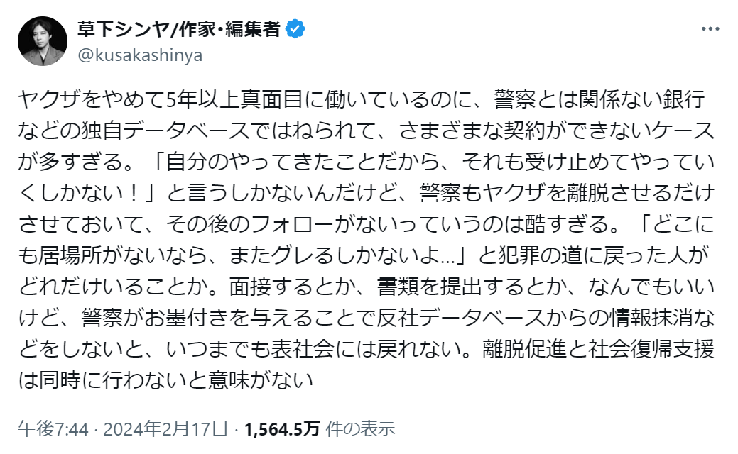 作家「ヤクザをやめて5年以上真面目に働いているのに銀行口座作れないのはおかしい。またグレるしかなくなる」 Twitter Facebook はてブ LINE コピー 2024.02.19 スポンサーリンク ◇ 1: 名無しさん 24/02/18(日) 11:11:50 ID:Nyl4 悲しいね https://twitter.com/kusakashinya/status/1758804709522161849 ◇ 5: 名無しさん 24/02/18(日) 11:13:21 ID:hRf5 俺バカだから分かんねぇけどよぉ…ならなきゃええんちゃうかな? ◇ 8: 名無しさん 24/02/18(日) 11:14:16 ID:gKeu ヤクザは携帯電話契約できないしヤクザなの隠して契約すると詐欺罪で捕まるからな今時携帯電話も持てなかったら何もできないやろ 続きを読む