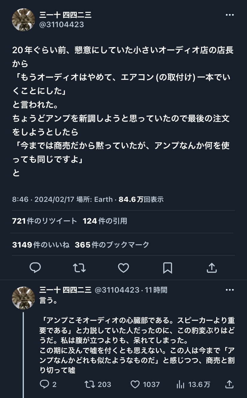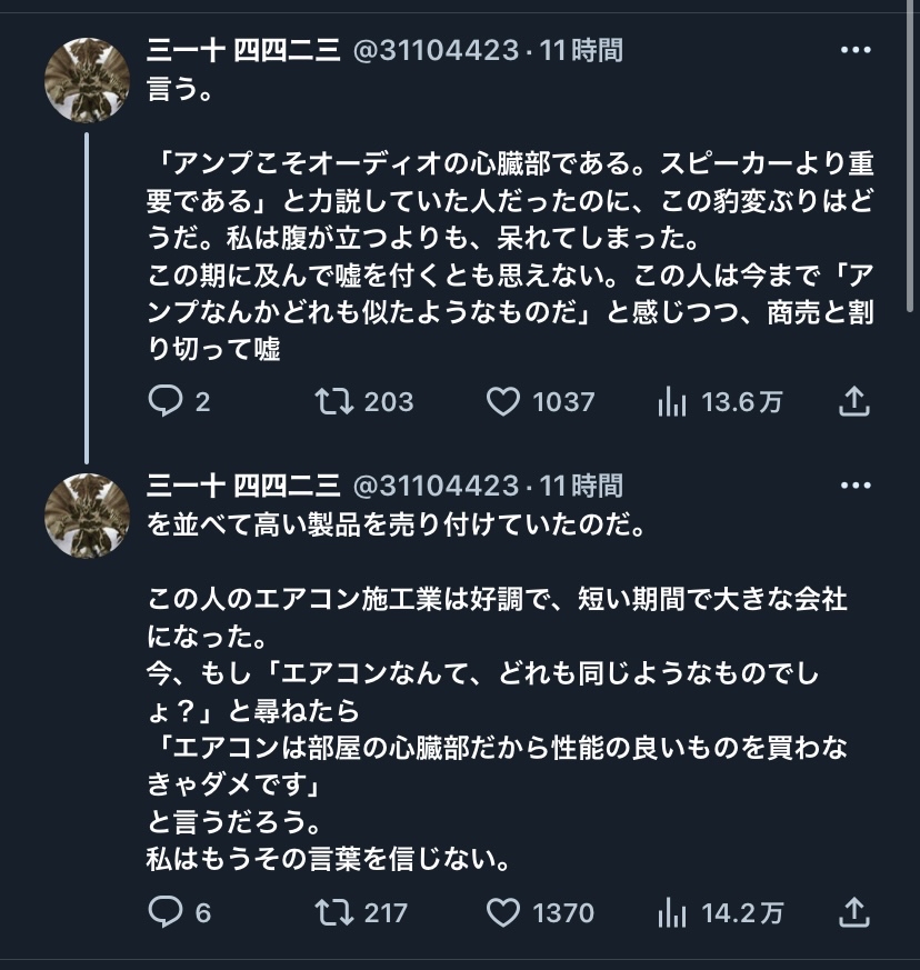 【悲報】オーディオマニアさん、電器屋に真実を言われてブチ切れwwww Twitter Facebook はてブ LINE コピー 2024.02.19 スポンサーリンク ◇ 1: それでも動く名無し 2024/02/19(月) 15:44:00.31 ID:4or5xR1w0 https://twitter.com/31104423/status/1758638897909928435 ◇ 3: それでも動く名無し 2024/02/19(月) 15:44:21.14 ID:4or5xR1w0 かなしいなあ ◇ 5: それでも動く名無し 2024/02/19(月) 15:45:59.01 ID:SdAHSLc70 オーディオは宗教だから 続きを読む