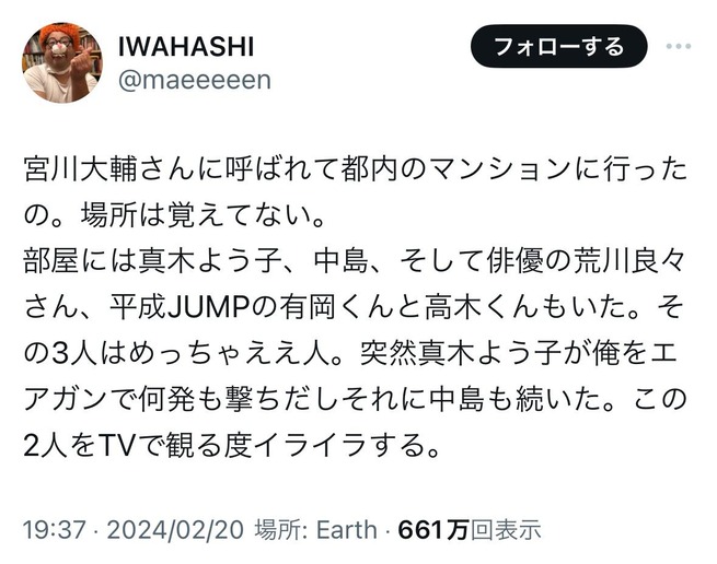 【悲報】真木よう子さん、マンションで男6女1の集まりで突然プラマイ岩橋にエアガンを撃ち出す Twitter Facebook はてブ LINE コピー 2024.02.21 スポンサーリンク ◇ 1: それでも動く名無し 2024/02/20(火) 22:06:36.15 ID:53XGihwk0 https://twitter.com/maeeeeen/status/1759890054925975974 ◇ 6: それでも動く名無し 2024/02/20(火) 22:10:09.02 ID:LJrWxR5I0 ホント根に持つタイプだな ◇ 9: それでも動く名無し 2024/02/20(火) 22:10:52.08 ID:yW3L58c20 草 てか普通にかわいそう 続きを読む