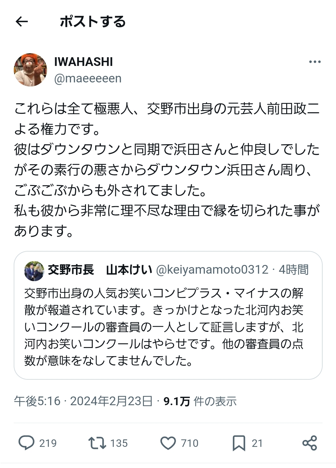 【悲報】岩橋神「ヤラセの元凶はダウンタウン同期で放送作家の前田政二です」 Twitter Facebook はてブ LINE コピー 2024.02.23 スポンサーリンク 1:それでも動く名無し:2024/02/23(金) 17:31:54.49 ID:4vYlxln20 2:それでも動く名無し:2024/02/23(金) 17:32:56.96 ID:g6CHerYsd 無敵 5:それでも動く名無し:2024/02/23(金) 17:33:52.73 ID:U29YgDUAd 市長出てくるのかよ草 岩橋事実しか話しとらんなこれ 続きを読む