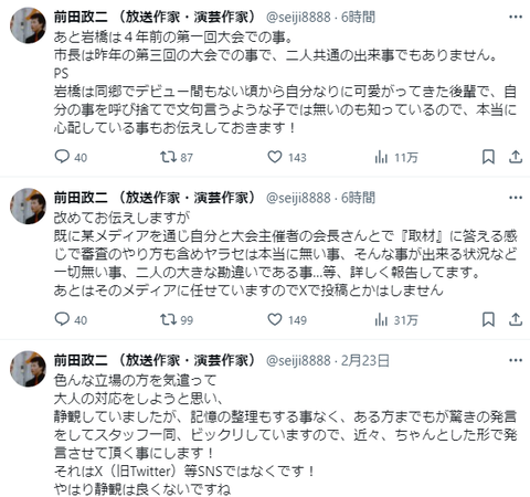 プラマイ岩橋・市長「お笑い大会はヤラセ!」→ただの勘違いだったwwwwwwwwww Twitter Facebook はてブ LINE コピー 2024.02.25 スポンサーリンク 1:それでも動く名無し:2024/02/25(日) 14:53:06.75 ID:0+966vg90 2:それでも動く名無し:2024/02/25(日) 14:53:54.86 ID:dqE3LaoS0 かわいがってきた後輩 3:それでも動く名無し:2024/02/25(日) 14:54:52.27 ID:JXPUjxAn0 第3回でプラスマイナス出演してる定期 5:それでも動く名無し:2024/02/25(日) 14:57:02.14 ID:0EdtFDIs0 速攻でバレてたの草 続きを読む