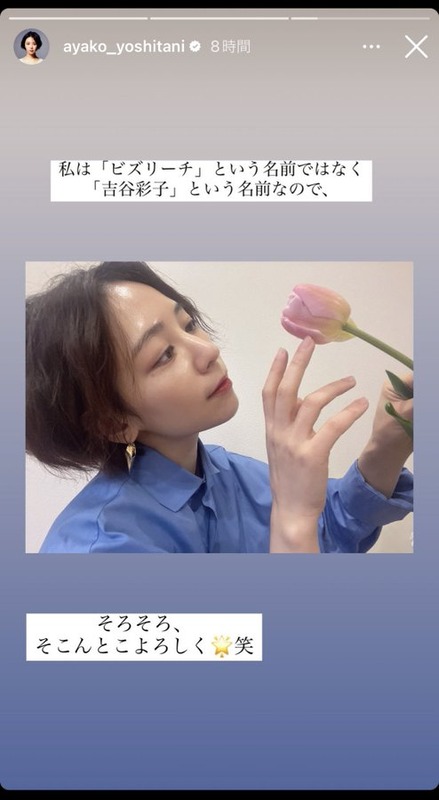 吉谷はInstagramのストーリーズで「私は『ビズリーチ』という名前ではなく『吉谷彩子』という名前なので、そろそろ、そこんとこよろしく笑」と発信。冗談めかしてはいるものの、ネット上の「ビズリーチ呼び」を気にしているらしいことをうかがわせている。