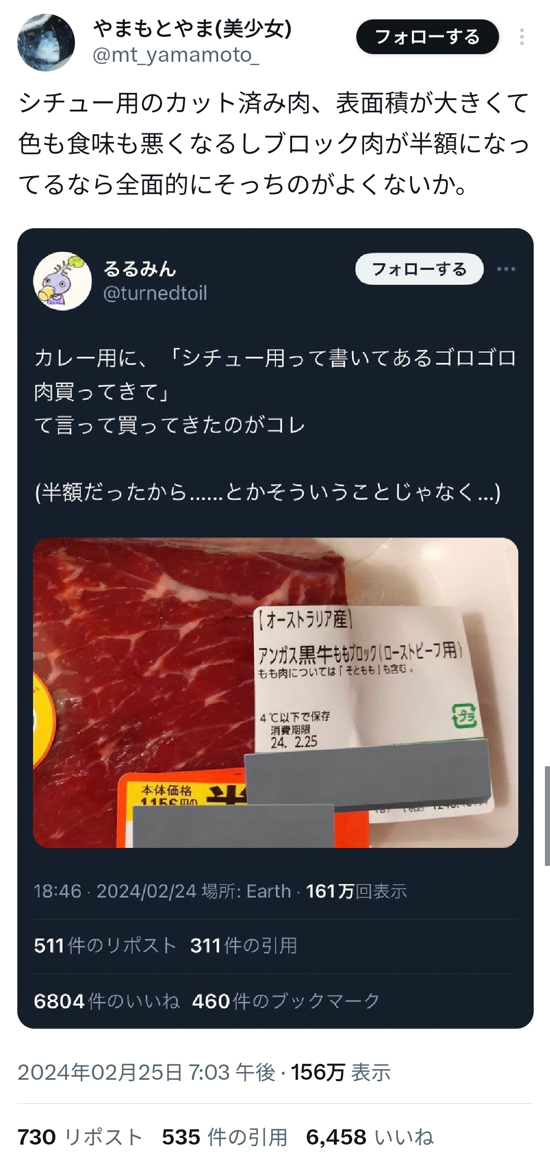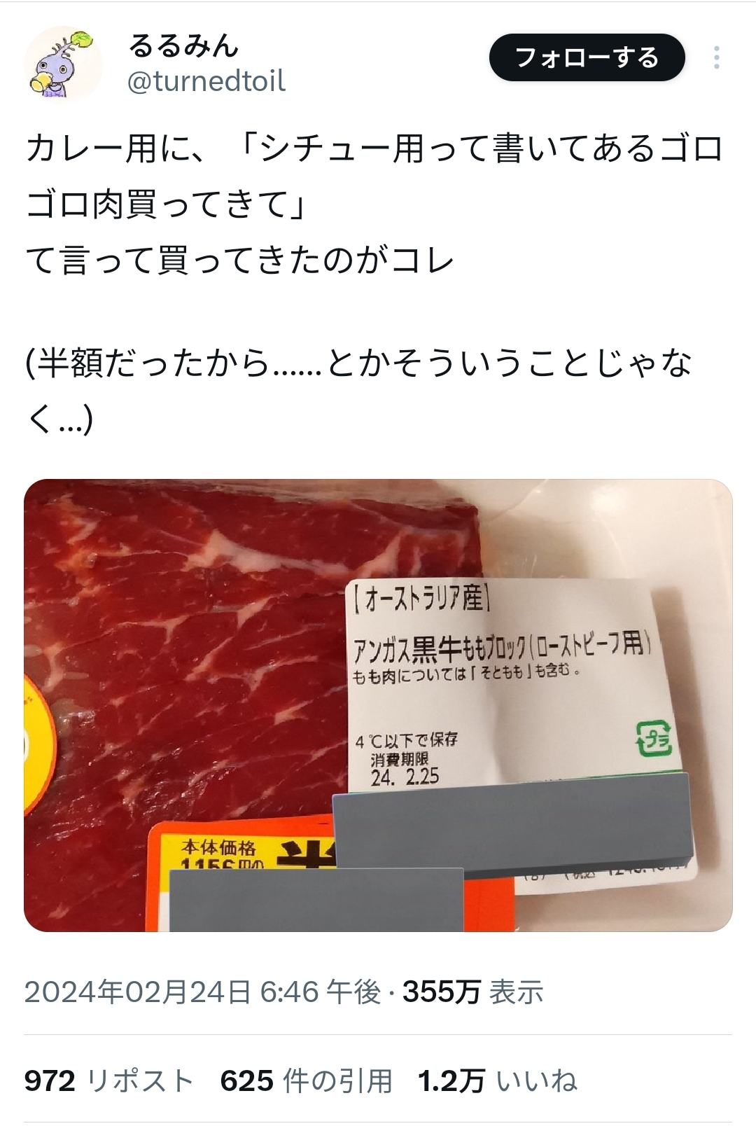 【悲報】女「旦那にシチュー用のゴロゴロ肉買ってきてと言ったのに買ってきたのがコレ→なぜか女が炎上 Twitter Facebook はてブ LINE コピー 2024.02.27 スポンサーリンク 1:それでも動く名無し:2024/02/27(火) 09:03:55.53 ID:OHe8nfP+0 ↓ 2:それでも動く名無し:2024/02/27(火) 09:04:20.64 ID:OHe8nfP+0 なんでや… 4:それでも動く名無し:2024/02/27(火) 09:04:51.45 ID:sur2k2QD0 ? 続きを読む