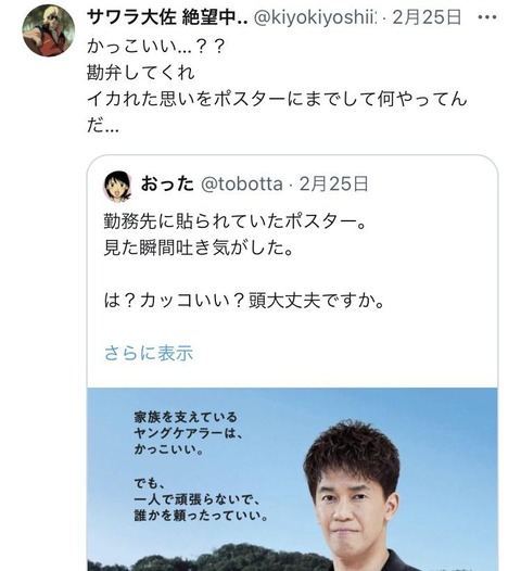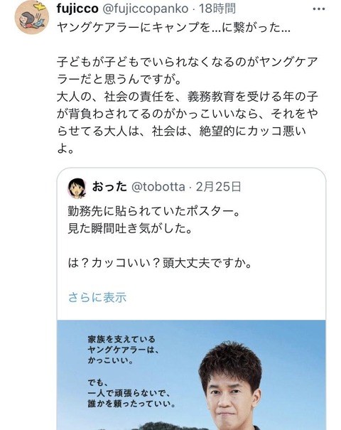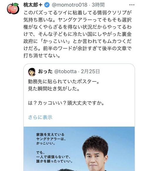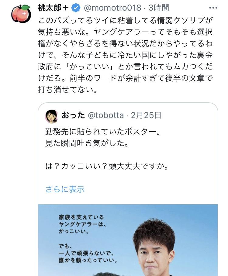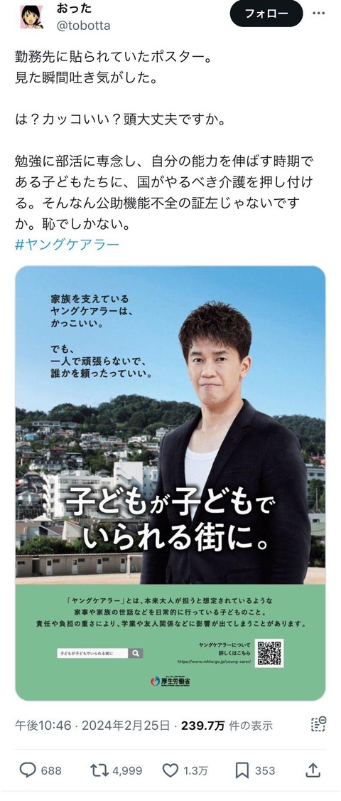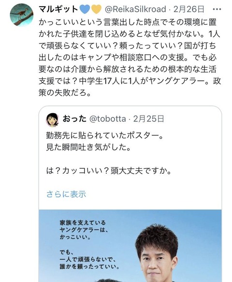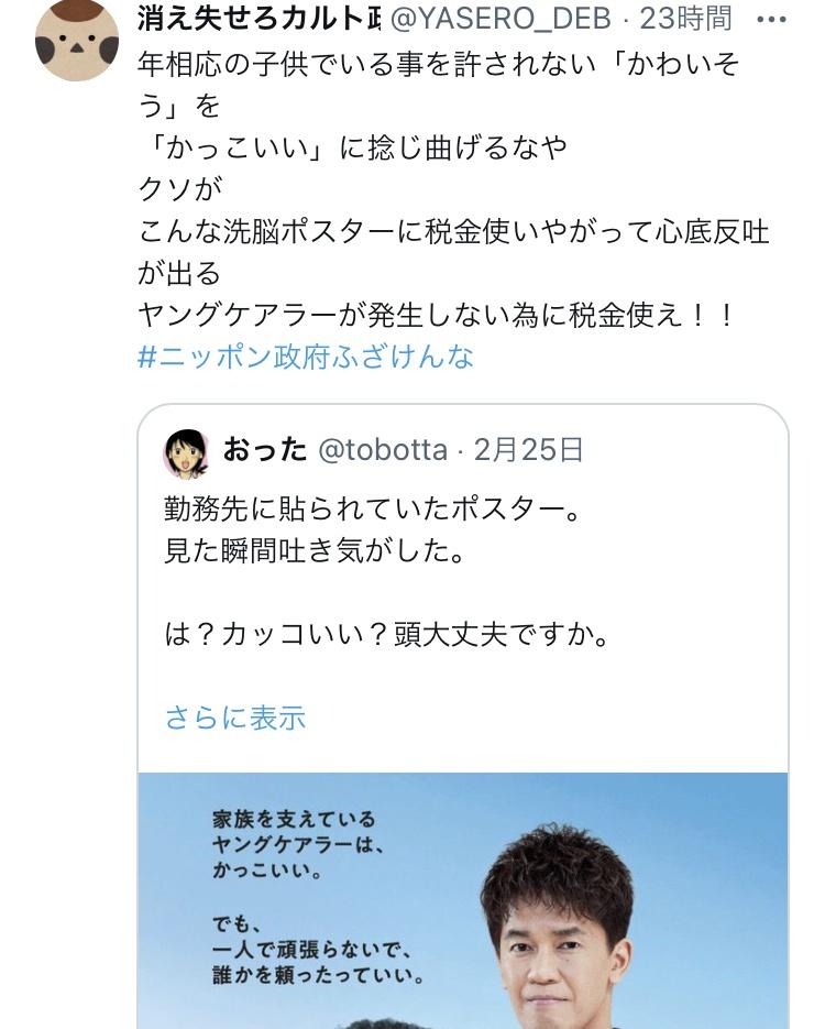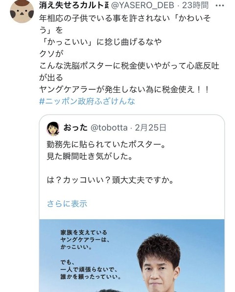 厚生労働省「家族を支えているヤングケアラーは、かっこいい。」→炎上wwwwwwwwwwwwwwwwwwwwwwww Twitter Facebook はてブ LINE コピー 2024.02.27 スポンサーリンク 1:うんち(茸) [US]:2024/02/27(火) 12:24:54.44 ID:O044avbQ0 BE:271912485-2BP(1500) ソース ↓ 批判殺到 https://i.imgur.com/ 続きを読む