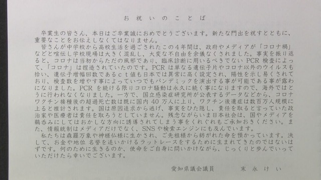 春日井市の県立高校の卒業生と保護者に配られた式次第で、掲載された祝辞の中にコロナをめぐる自らの主張で埋め尽くされたものがあり、物議を醸している。